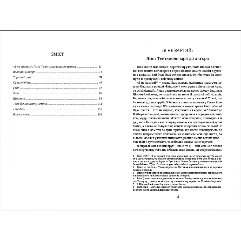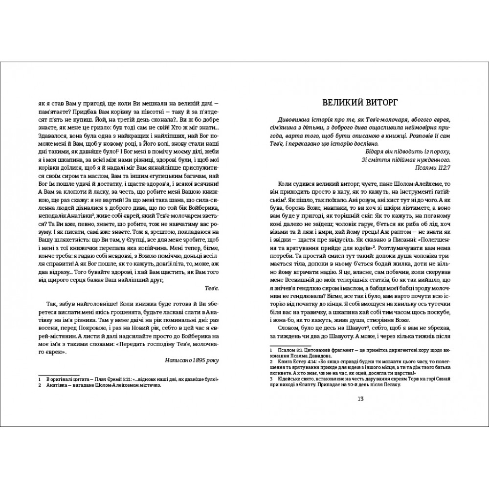 Смішна і трагічна історія Тев’є, молочара з єврейського містечка (штетля), лягла в основу чи не найпопулярнішого бродвейського м’юзикла «Скрипаль на даху» та його численних кіно- та театральних варіацій. Нескінченно мудрі, насичені особливим гумором історії Тев’є звернені нібито до автора, а насправді до кожного особисто. Вони - не лише про штетль, жінок та дружину Тев’є, його сусідів, вони - про дивовижну красу непростого життя загалом.
