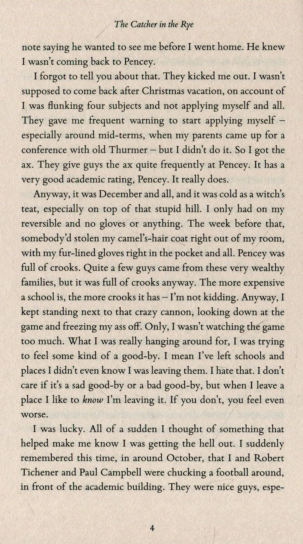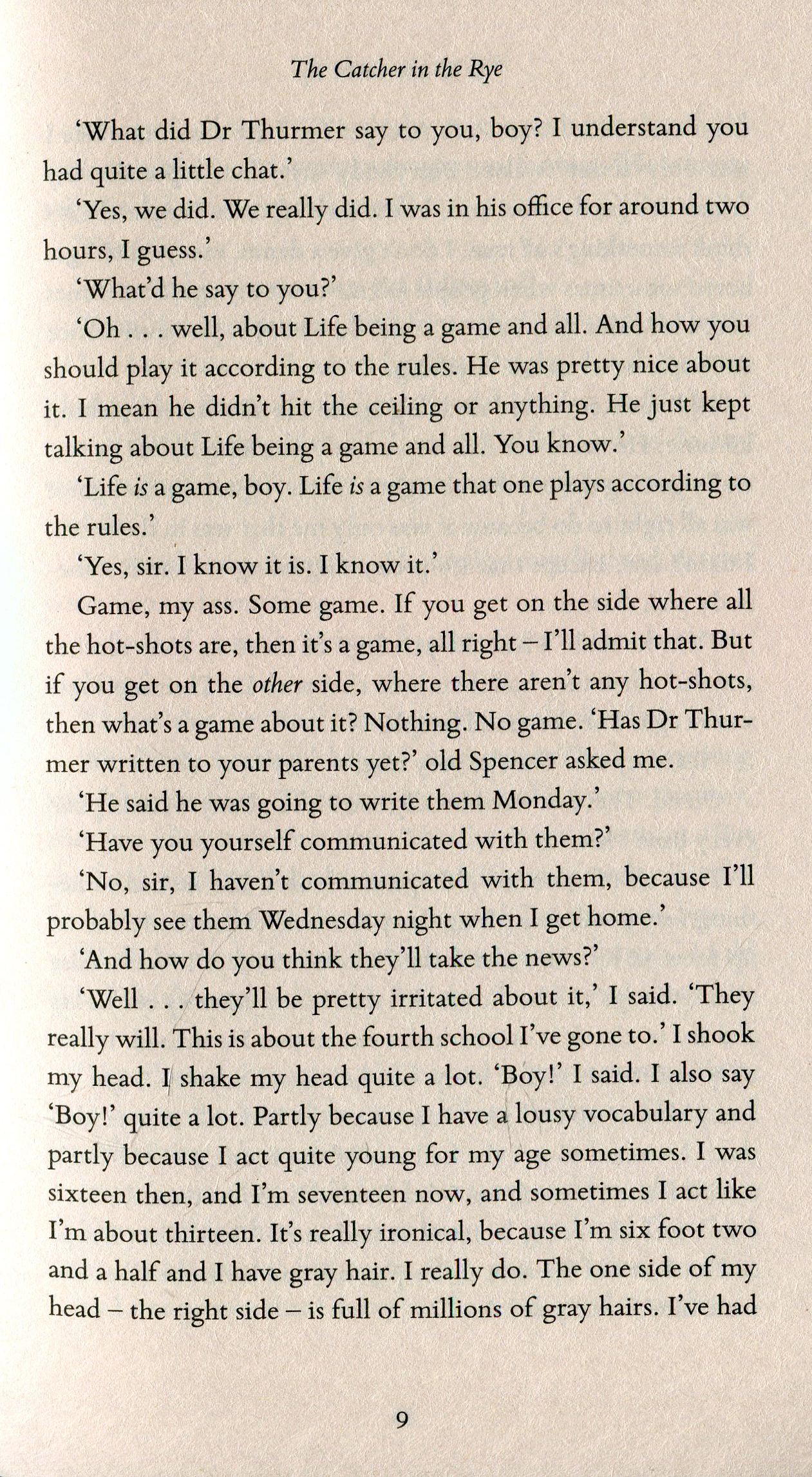 The Catcher in the Rye is J . D. Salinger's world-famous novel of disaffected youth. Holden Caulfield is a seventeen- year-old dropout who has just been kicked out of his fourth school. Navigating his way through the challenges of growing up, Holden dissects the 'phony' aspects of society, and the 'phonies' themselves: the headmaster whose affability depends on the wealth of the parents, his roommate who scores with girls using sickly-sweet affection. Written with the clarity of a boy leaving childhood behind, The Catcher in the Rye explores the world with disarming frankness and a warm, affecting charisma which has made this novel a universally loved classic of twentieth-century literature.
