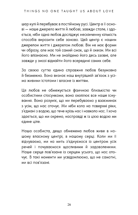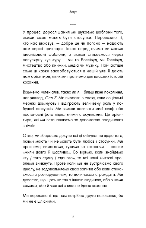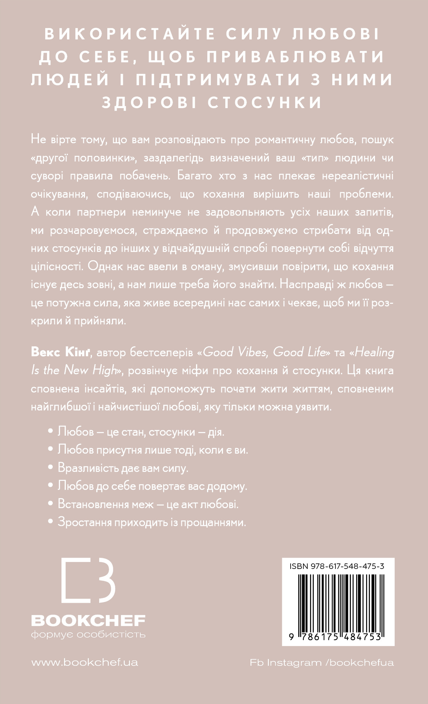 Люди — соціальні істоти. Але майже неможливо побудувати здорові, стійкі зв’язки з іншими, не маючи хороших стосунків із собою. Щоб порозумітися з іншими, ми часто змінюємо свої звички або приховуємо свою унікальність. Намагаючись змінити або придушити своє справжнє я, ми підриваємо свою самооцінку та самопізнання. Ми починаємо втрачати з поля зору те, ким ми є насправді й чого насправді хочемо. Коли наше саморозуміння та впевненість у собі пошкоджені, це зрештою шкодить нашим стосункам. У цій трансформаційній книзі автор бестселерів Векс Кінґ показує, як знаходити та підтримувати ті зв’язки, яких ми хочемо з собою та іншими. Хороші стосунки починаються з любові до себе й визнання власних бажань та потреб. Це дозволяє нам випромінювати впевненість, а також залучати й вибирати партнерів — романтичних і платонічних, — справді сумісних із нами