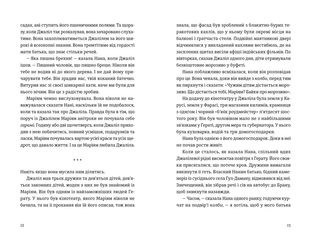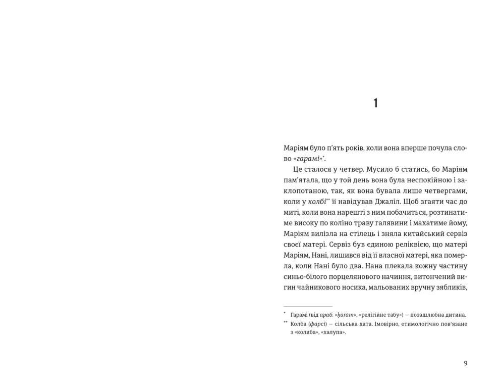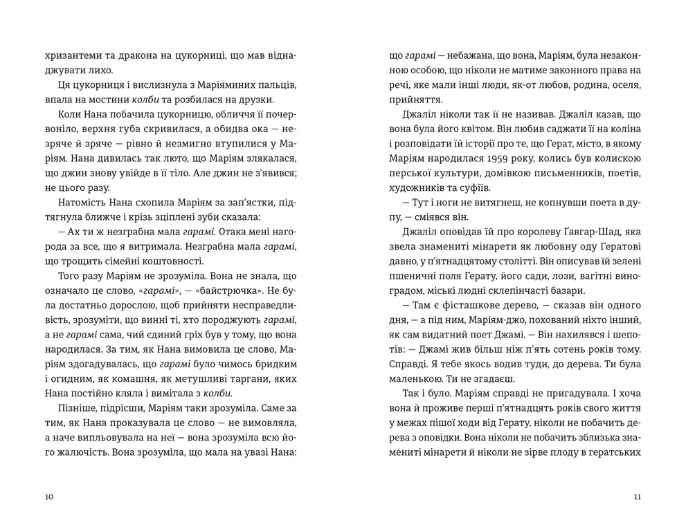Маріям з раннього віку засвоїла, що як стрілка компаса завжди вказує на північ, так і звинувачувальний палець чоловіка завжди вказує на жінку. А ще, що жінкам потрібне в житті тільки одне вміння, якого не вчать у школі: тагаммуль — терпіння.