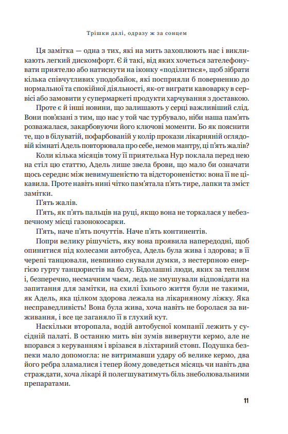 Це глибоко зворушливий роман. Про життя, любов, сім’ю і, перш за все, втрату близької людини, яка пішла занадто рано. Цей твір — ода життю, наперекір усьому. Ковток свіжого повітря, з усмішкою в кінці історії. Логічний фінал, сповнений любові. Саме такий, як ми любимо.
