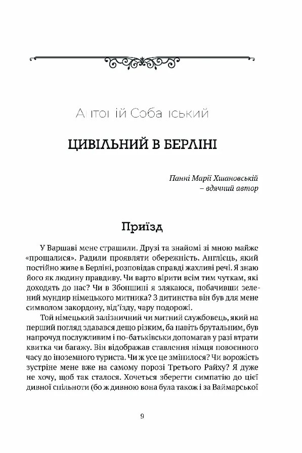 Антоній Собанський (1898–1941) – аристократ, світський лев, поліглот, журналіст, автор книги «Цивільний в Берліні» – серії репортажів з Німеччини після перемоги нацистів на виборах. Кілька разів він їздив до Німеччини, щоб на власні очі переконатися, як націонал-соціалізм змінює життя німців. Собанський стає, серед іншого, очевидцем знаменитого спалення книг, відвідує «партайтаґ» у Нюрнберзі та з жахом слухає пресконференцію «відвертого психопата» Юліуса Штрайхера.