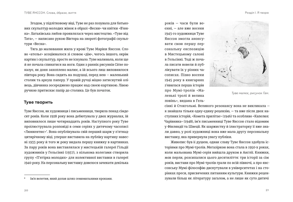 Життя Туве Янссон, всесвітньо відомої художниці та письменниці, було сповнене праці, любові та постійних творчих пошуків. Туве малювала химерні автопортрети, рисувала політичні карикатури і комікси, писала пригодницькі та філософські історії, спорудила дім на острові, навчалася, кохала, подорожувала і ділила свій час між іпостасями малярки, ілюстраторки та письменниці. Це внутрішнє протистояння між словом і зображенням, між серйозним мистецтвом і прибутковим ремеслом, між «Мумі-мамою» і авторкою для дорослих супроводжували її постійно.