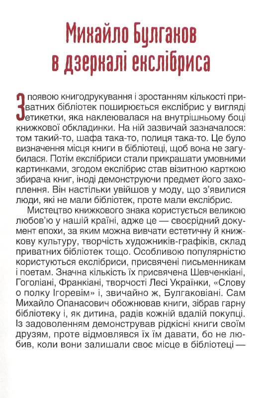 Багато ілюстроване видання мовою графічного мистецтва розповідає про творчість одного з найвидатніших письменників минулого століття Михайла Булгакова й демонструє прихільність до нього численних шанувальників його творчості — як митців, так і книголюбів, через графічну мініатюру — екслібрис. Книгу присвячено 130-й річниці від дня народження М. Булгакова.