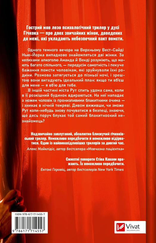 Одного темного вечора на Верхньому Вест-Сайді Нью-Йорка випадково знайомляться дві жінки. За келихами алкоголю Аманда й Венді розуміють, що мають багато спільного, — передусім самотність і пекуче бажання помсти чоловікам, які зруйнували їхні родини. Розмова затягується до пізньої ночі, і зрештою вони вигадують ідеальний план: якщо ти вб'єш для мене — я вб'ю для тебе.