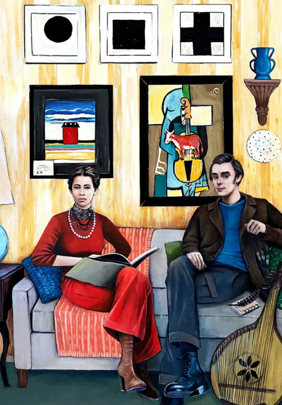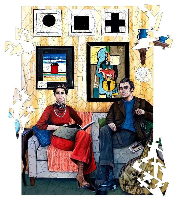 Дерев’яний фігурний пазл «В гостях у Малевича» - це фантастична подорож у минуле, де зображено візит Тараса Шевченка та Лесі Українки до українського художника-авангардиста Казимира Малевича в його домі у Києві.