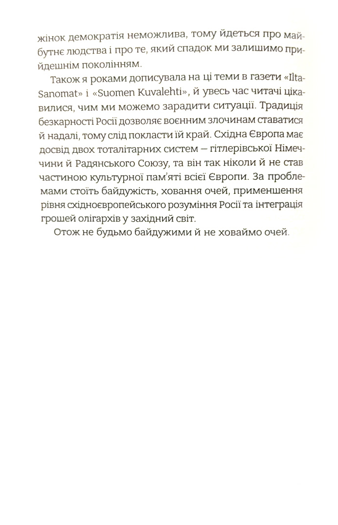 У своїх загарбницьких війнах Росія завжди використовувала одні й ті самі методи: депортація, русифікація, пропаганда, терор цивільного населення, знищення культури. Росія ніколи не просила вибачення і не була покарана за свої злочини. Геракліт помилявся: в одну річку можна ввійти двічі. І лише засудження зла спроможне його зупинити.