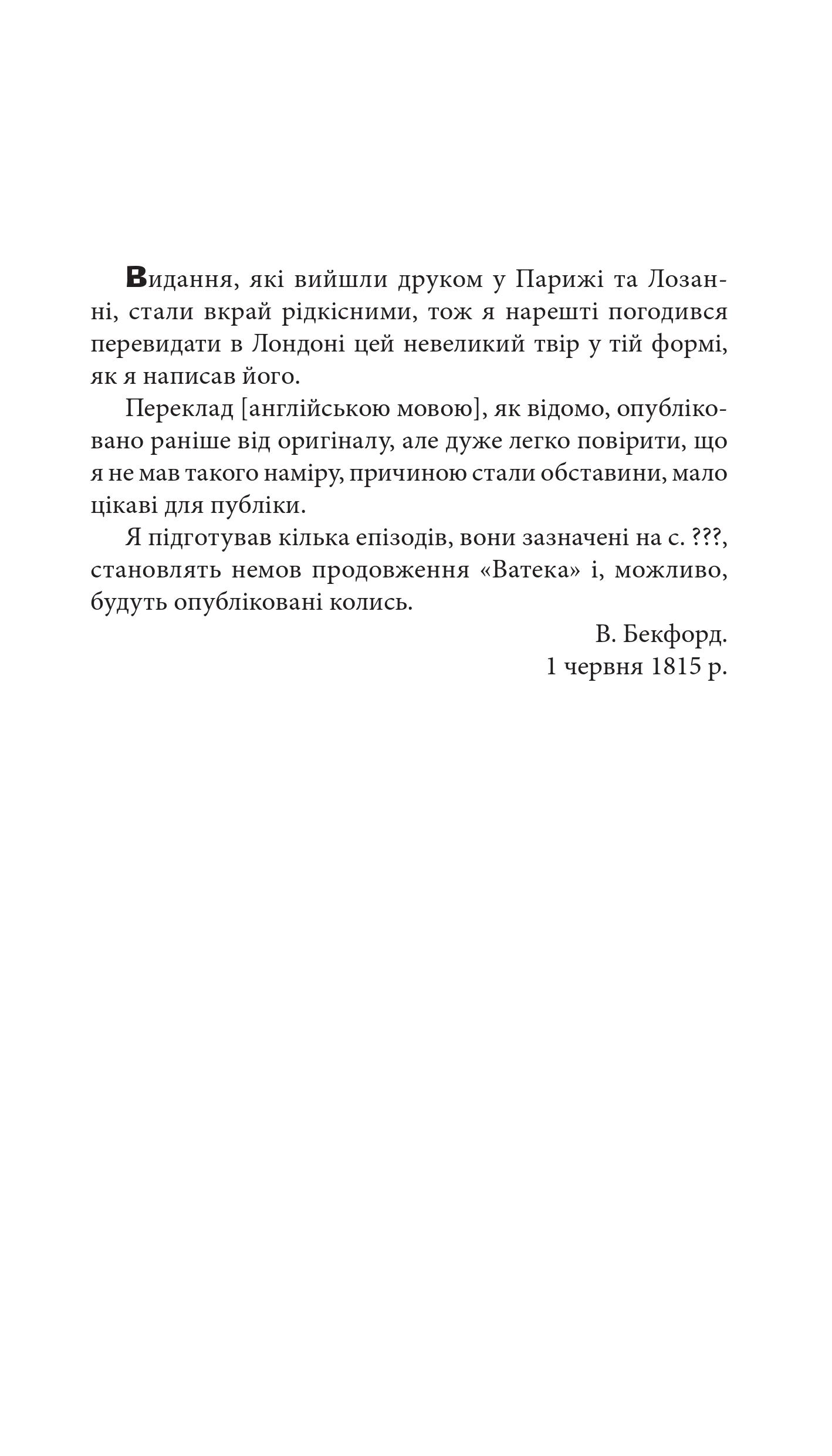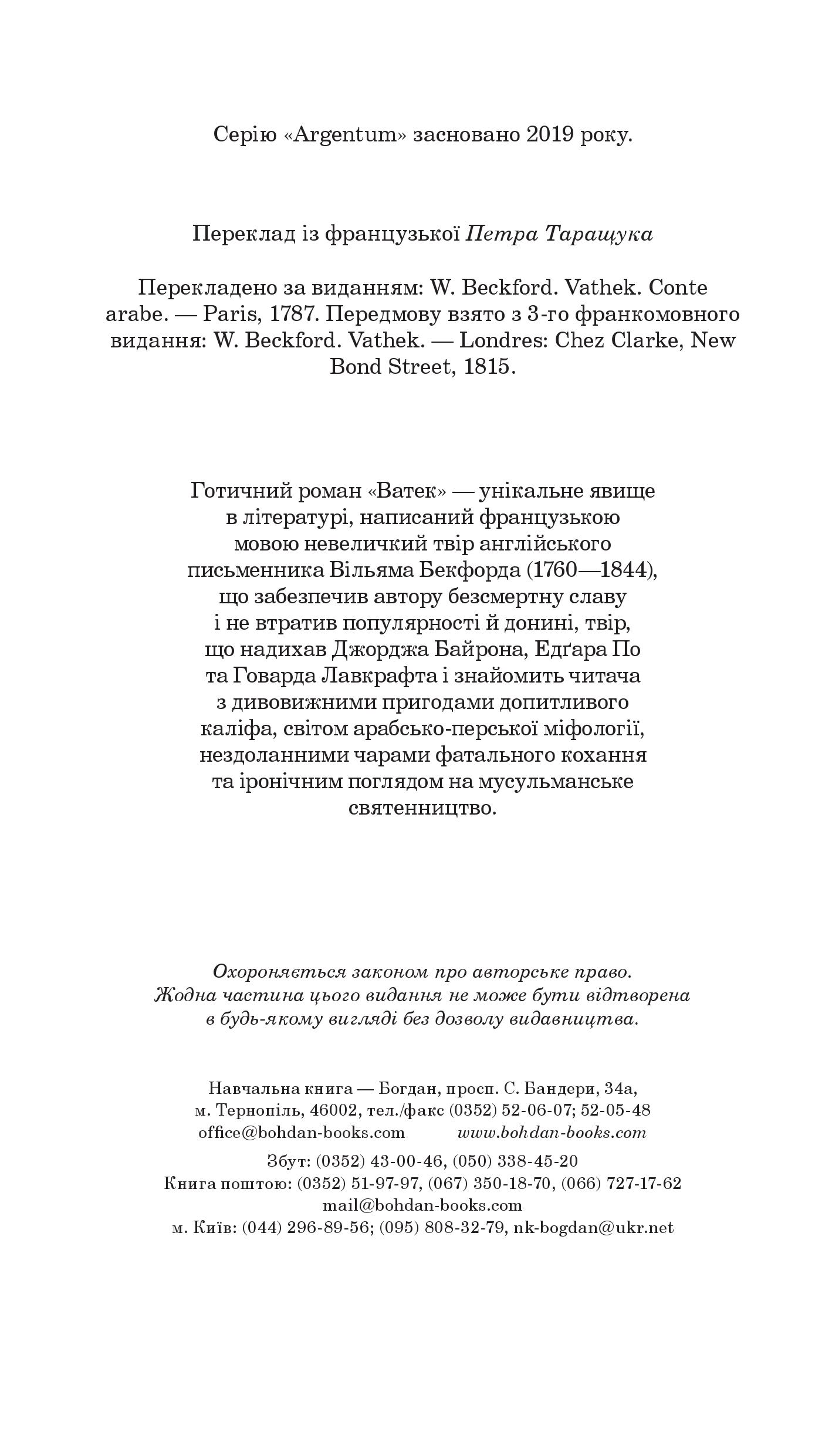 Готичний роман «Ватек» — унікальне явище в літературі, написаний французькою мовою невеличкий твір англійського письменника Вільяма Бекфорда (1760—1844), що забезпечив автору безсмертну славу і не втратив популярності й донині, твір, що надихав Джорджа Байрона, Едґара По та Говарда Лавкрафта і знайомить читача з дивовижними пригодами допитливого каліфа, світом арабсько-перської міфології, нездоланними чарами фатального кохання та іронічним поглядом на мусульманське святенництво.