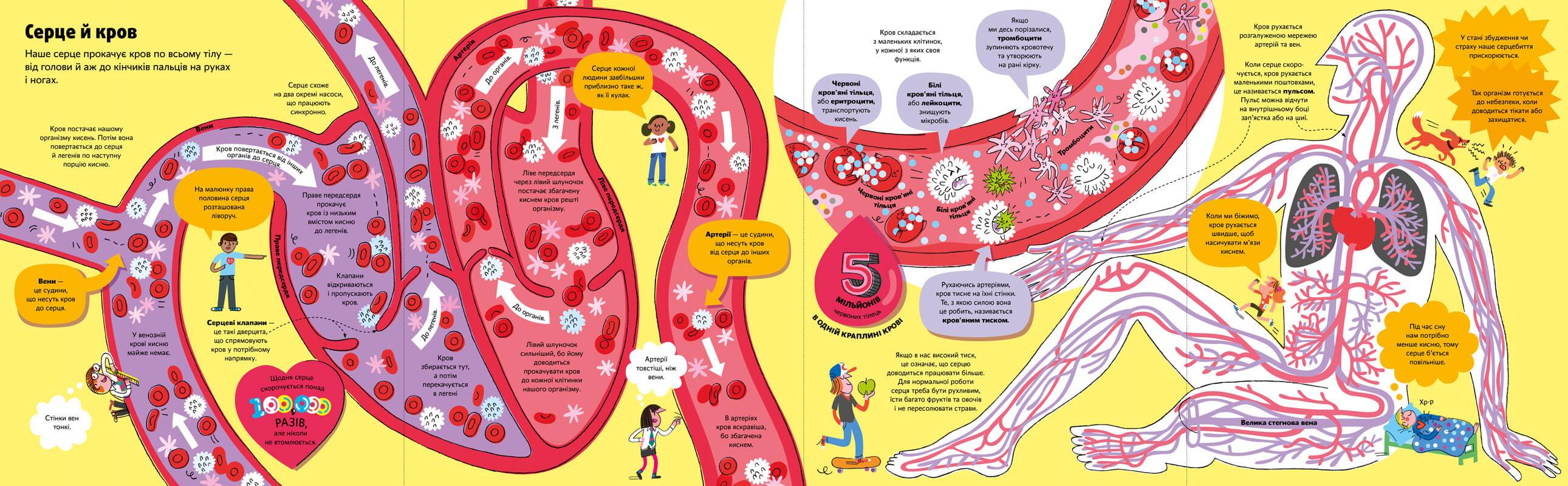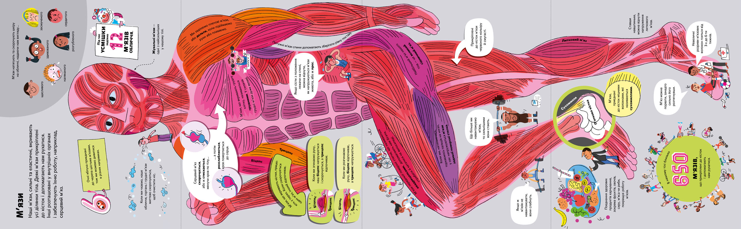 Книга Мінни Лейсі та Пітера Аллена має 4 велетенські розгортки на яких можна побачити, як дивовижно функціонують м’язи, яку будову має серце, як побудовано наш скелет та прослідкувати подорож їжі організмом.