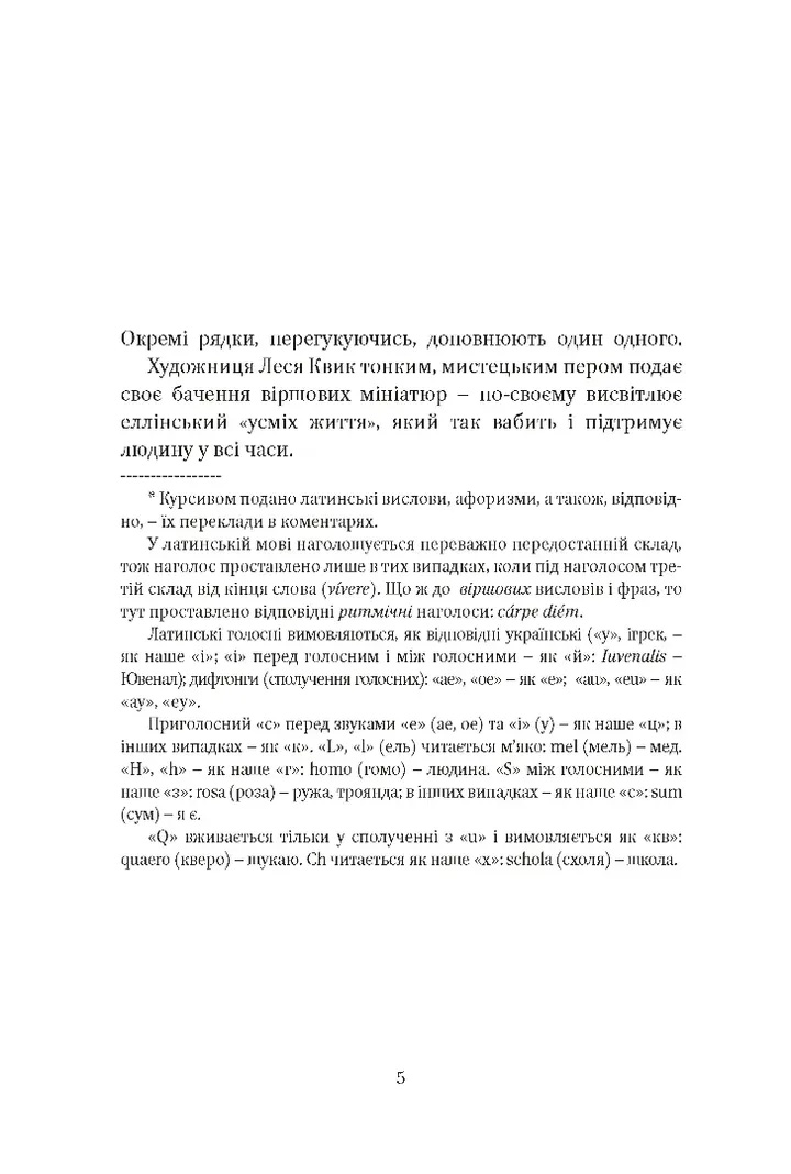 У цій книжці чи не вперше в нашій літературі поряд з українськими звучать вписані в тексти поетичних мініатюр латинські слова, вислови, афоризми. У їх гармонійному співзвуччі відлунюють започатковані ще в гомерівські часи вічні теми, в яких – жива тяглість людських думок, образів, почуттів (про це – в коментарях).