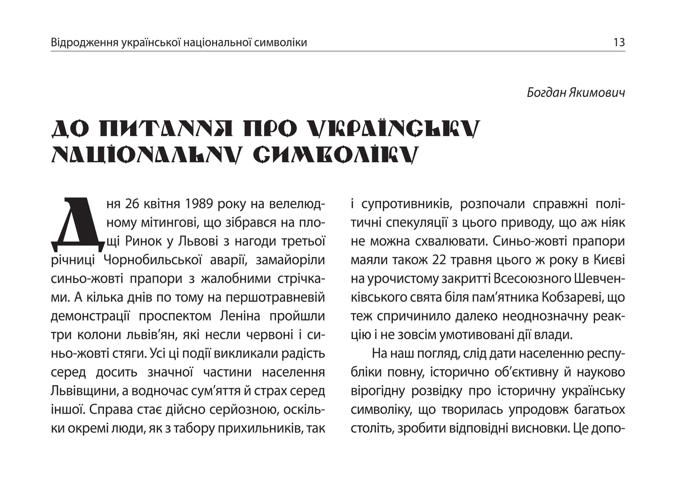 У цьому виданні представлено низьку матеріалів і документів, присвячених історіїї української національної символіки та її відродженню у період боротьби за українську державність і після здобуття Незалежності. До другої частини збірнина включено статті за тематичним приципом. Відкривають її дослідження традицій етнічної символіки, а завершують статті, в яких розвінчуються провокаційні вигадки, активно поширювані в умовах російсько-української гібридної війни як засіб інформаційної агресії для розпалювання конфліктів серед українських громадян.