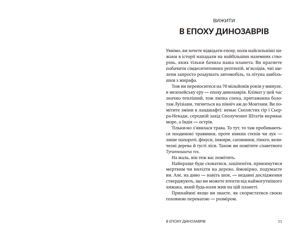 «Вижити» — це незвична й цікава розповідь про п’ятнадцять найбільш катастрофічних подій в історії Землі, яка дає читачеві змогу краще пізнати кожну її епоху.