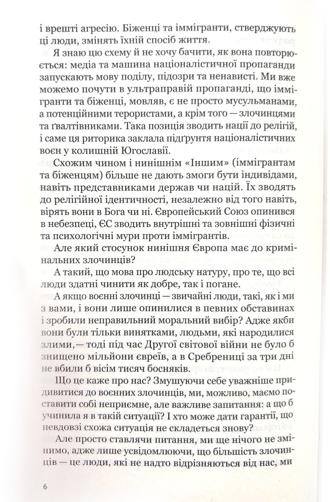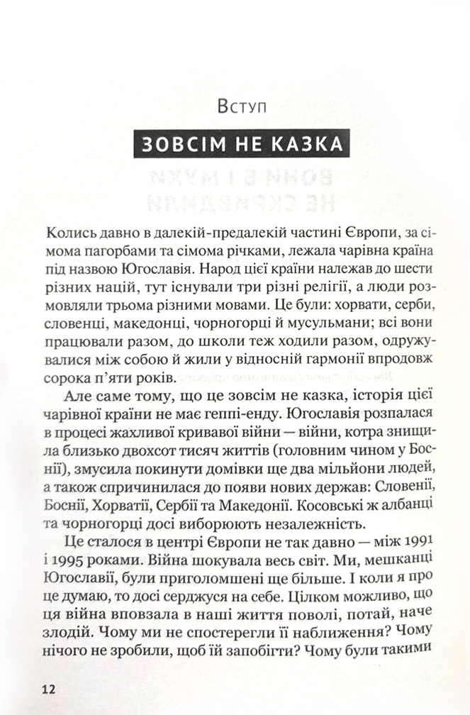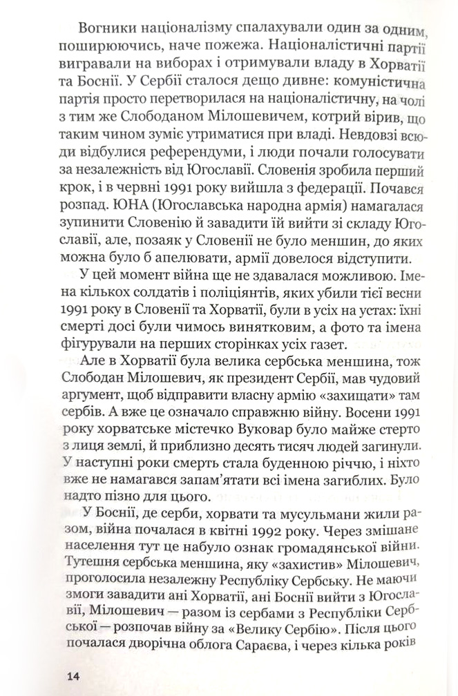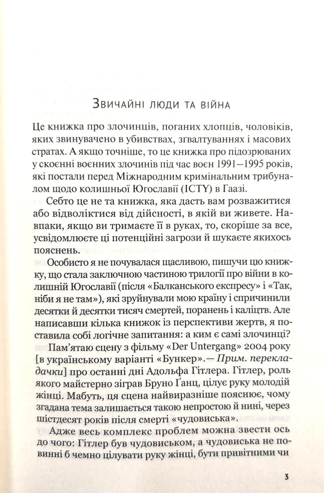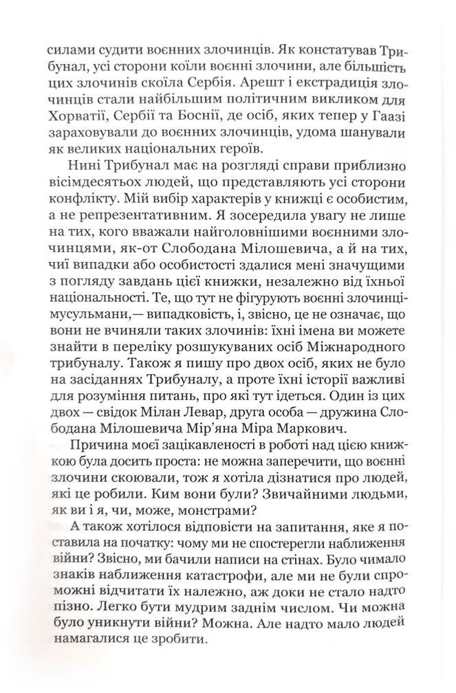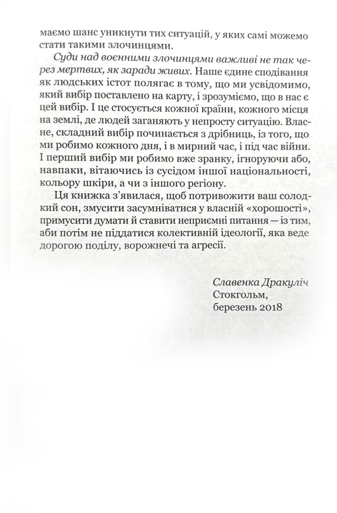 Шукаючи відповіді на ці питання, Славенка Дракуліч спостерігала за розглядами справ на засіданнях Міжнародного кримінального трибуналу в Гаазі щодо воєнних злочинів у колишній Югославії. За моторошними випадками насильства й смертями сотень тисяч людей авторка намагається розгледіти суть — причини конфлікту, що тлів упродовж певного часу, та суспільні зрушення й політичні жести, що зумовили його вибух.