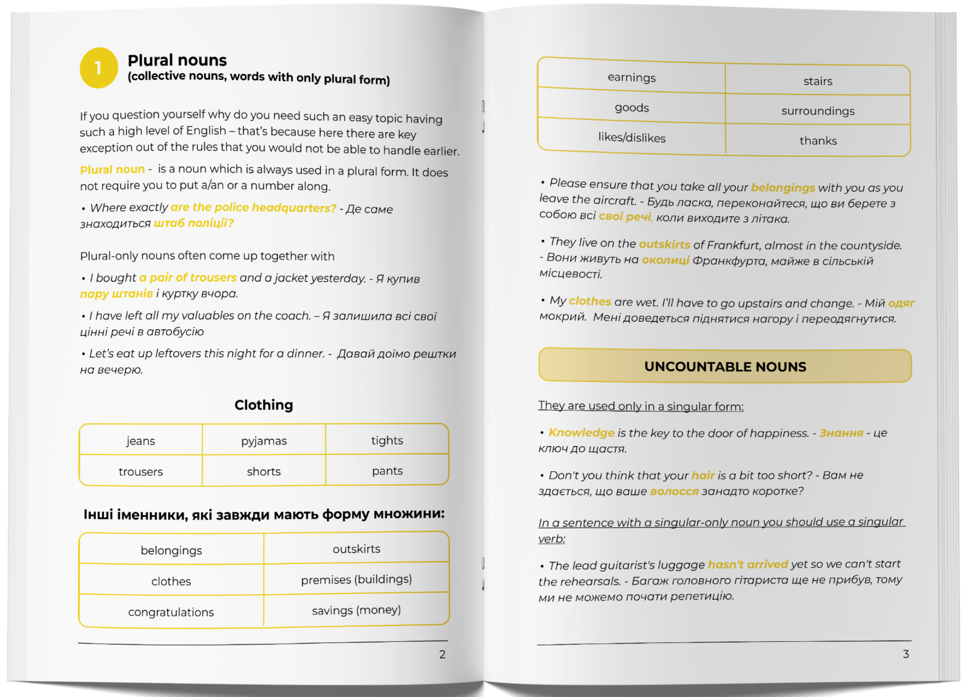 - усередині - 14 граматичних тем для високого рівня з детальним поясненням, прикладами, особливостями та порадами;