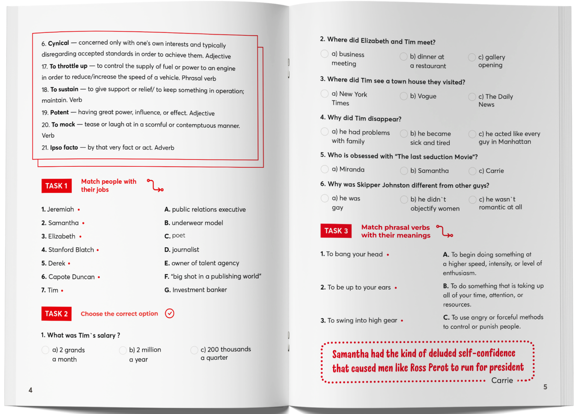- після кожної серії є вправи на вивчення граматики, відпрацювання лексики, аудіювання та читання (всього їх 35);