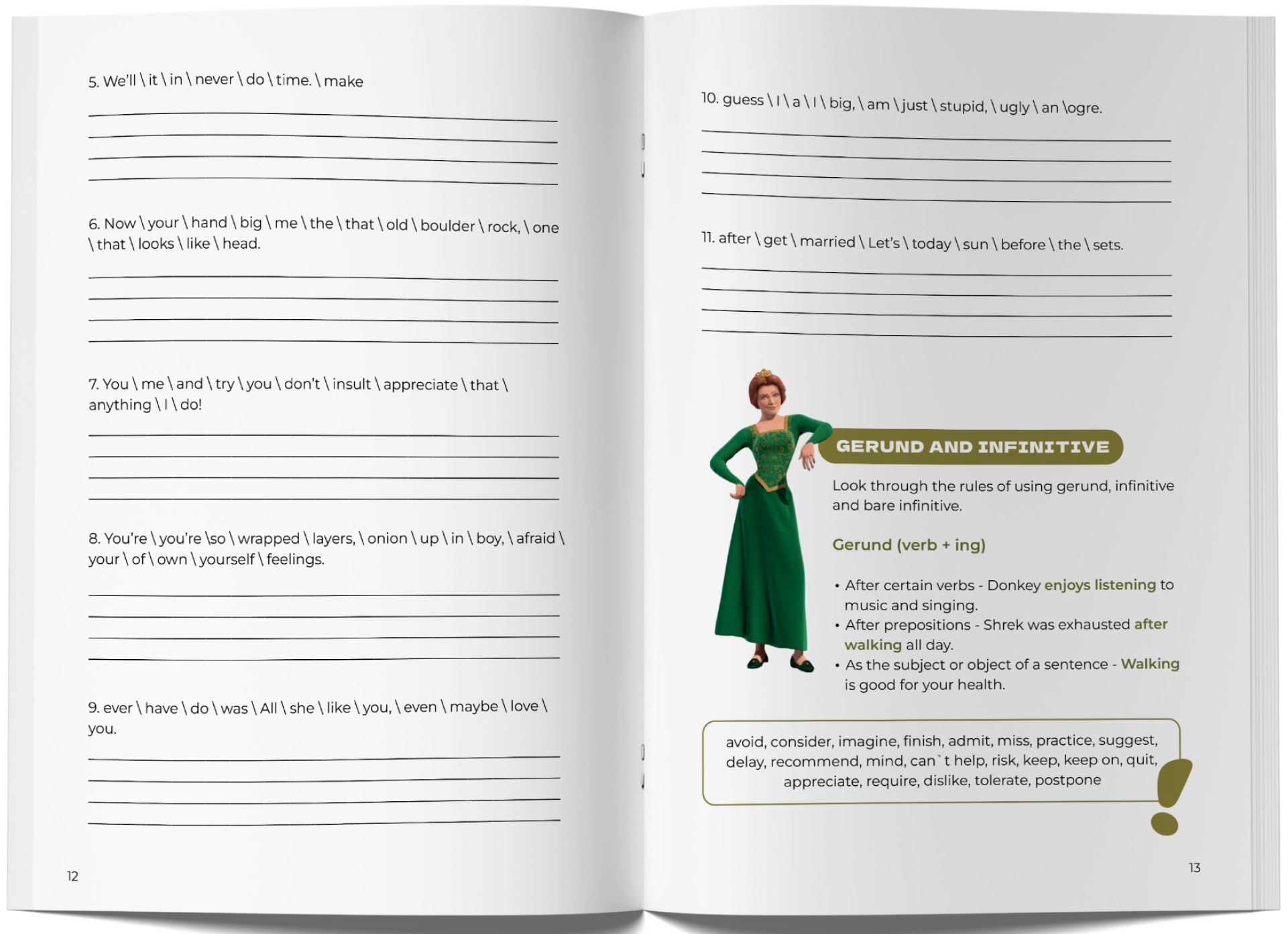 - після кожної частини наведені вправи на закріплення лексики, розвиток навичок з читання та аудіювання, а також вивчення нових тем з граматики;