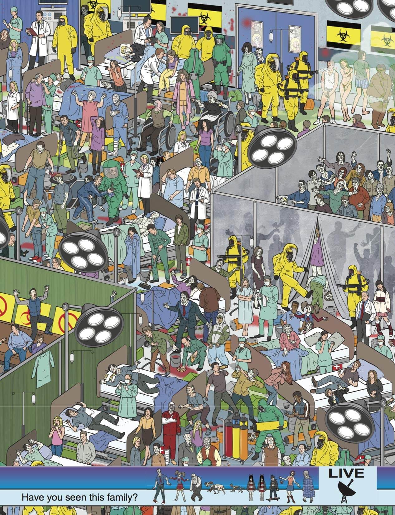 Книга «Де зомбі?» містить 48 сторінок повнокольорових ілюстрацій. обіцяє розважити, розважити та налякати читачів, які полюють за родиною зомбі серед натовпу в цій книзі про зомбі.