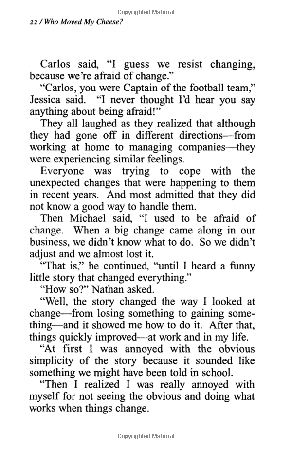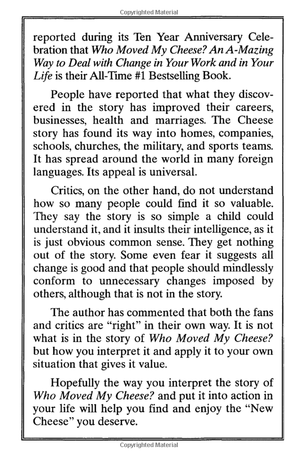 Who Moved My Cheese? is an amusing and enlightening story of four characters who live in a maze and look for cheese to nourish them and make them happy. Cheese is a metaphor for what you want to have in life - whether it is a good job, a loving relationship, money or a possession, health or spirital peace of mind. And the maze is where you look for what you want - the organisation you work in, or the family or community you live in. This profound book from bestselling author, Spencer Johnson, will show you how to anticipate change, adapt to change quickly, enjoy change and be ready to change quickly again and again. Discover the secret for yourself and learn how to deal with change, so that you suffer from less stress and enjoy more success in your work and in life. Written for all ages, this story takes less than an hour to read, but its unique insights can last for a lifetime.