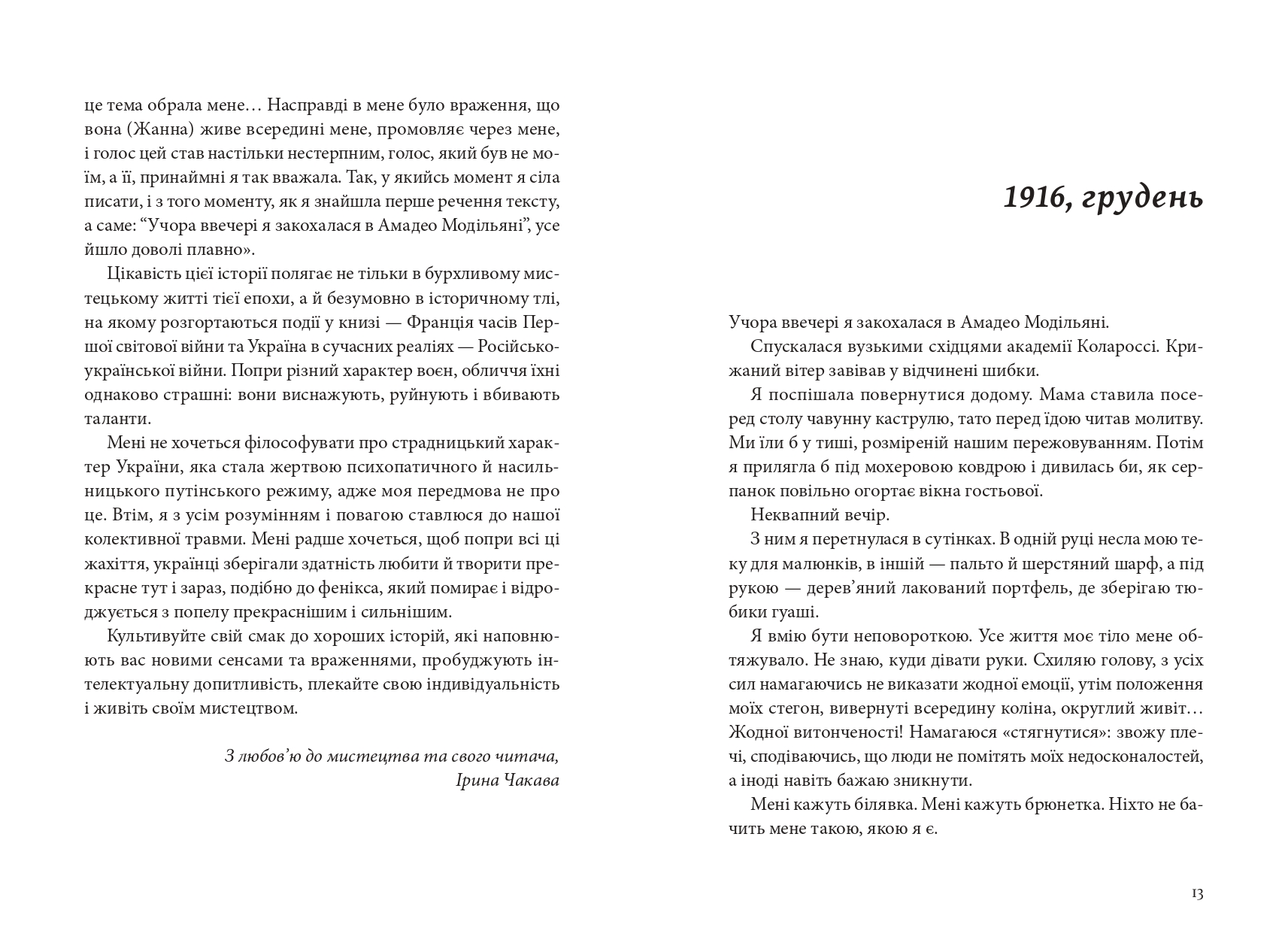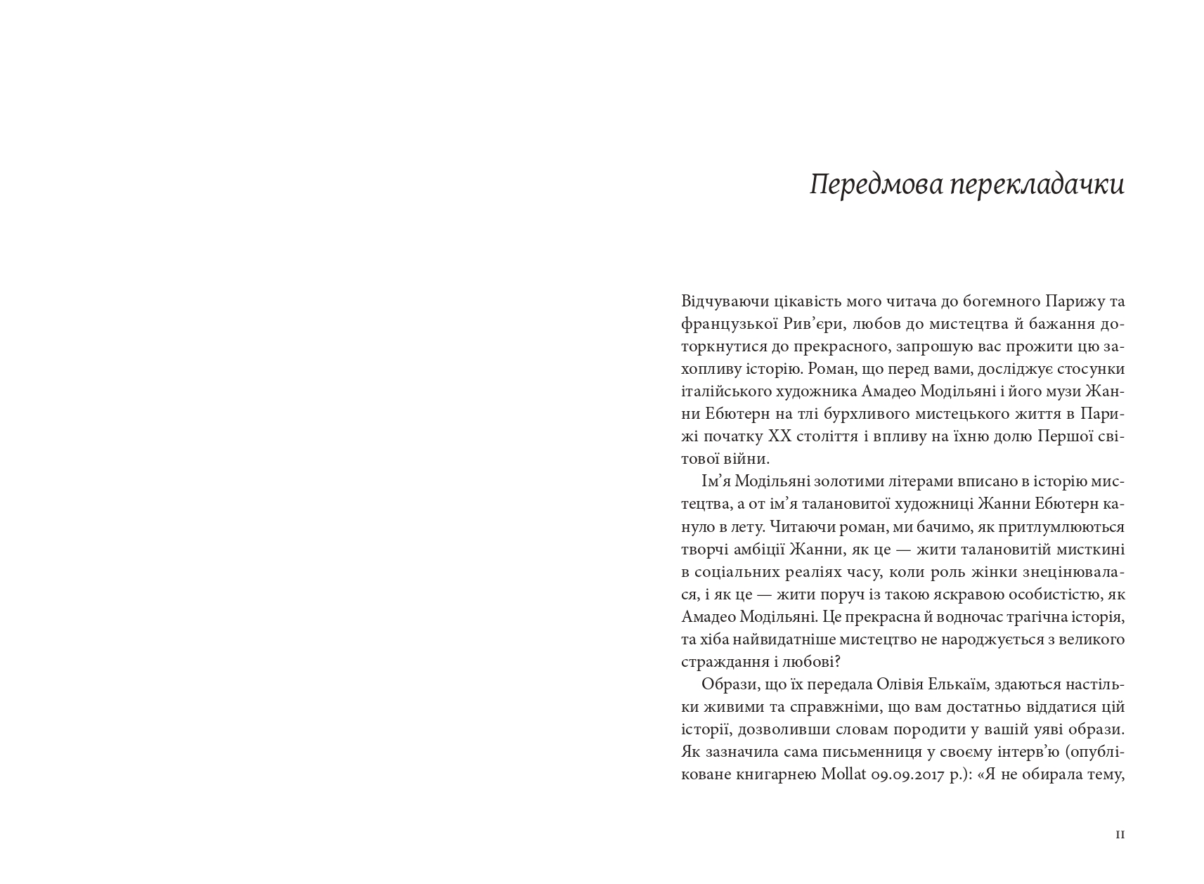Ця трагічна, але водночас прекрасна історія кохання розгортається на тлі буремного мистецького життя Парижа початку XX століття. Амадео Модільяні — талановитий художник, чий унікальний, загадковий та елегантний стиль легко впізнати з першого погляду: витягнуті обличчя та фігури, непромальовані очі, приглушені кольори, плавні та витончені контури, меланхолійні й тендітні портрети. Він творив із пристрастю, що палала в ньому, навіть коли його життя згасало. Втім, ця історія — і про неї, Жанну Ебютерн, не лише як музу та кохану, а і як мисткиню, яка, попри своє безмежне та сакральне кохання до Амадео, мала власні амбіції, що часто губилися в тіні знаменитого коханого.