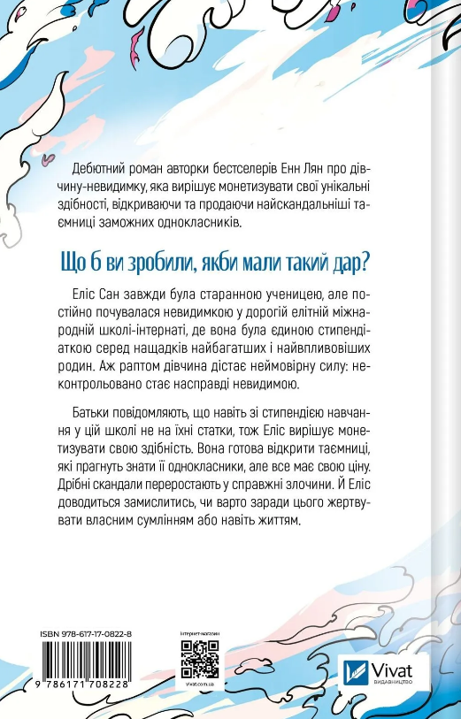 Еліс Сан завжди була старанною ученицею, але постійно почувалася невидимкою у дорогій елітній міжнародній школі-інтернаті, де вона була єдиною стипендіаткою серед нащадків найбагатших і найвпливовіших родин. Аж раптом дівчина дістає неймовірну силу: неконтрольовано стає насправді невидимою. Що б ви зробили, якби мали такий дар?
