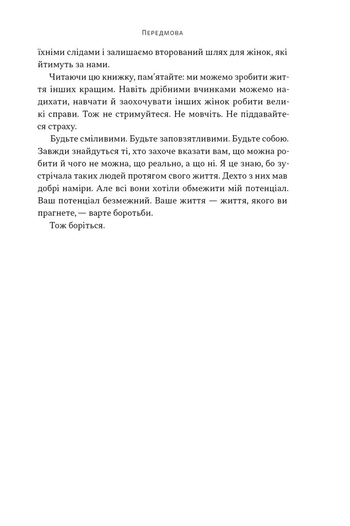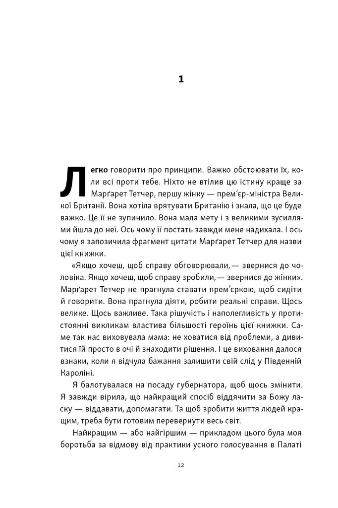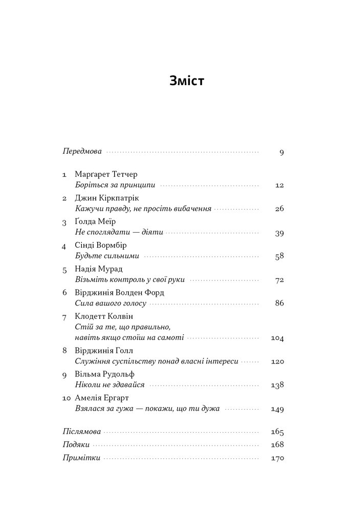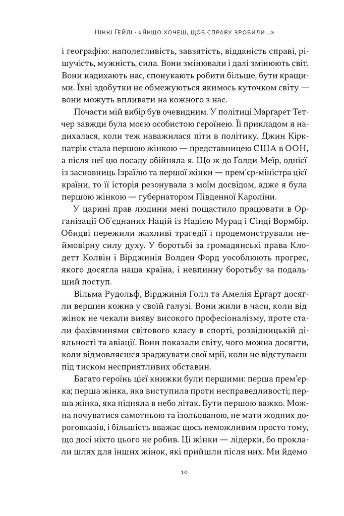 Що об’єднує прем’єрку, спортсменку, правозахисницю й шпигунку? Усім їм довелося діяти в умовах, які потребували надзусиль. І всі вони змінили світ. У цій книжці Ніккі Гейлі, яка сама пройшла шлях від чужинки і «занадто молодої» до представниці США в ООН і кандидатки в президенти, ділиться десятьма історіями жінок, чия рішучість переписувала історію.
