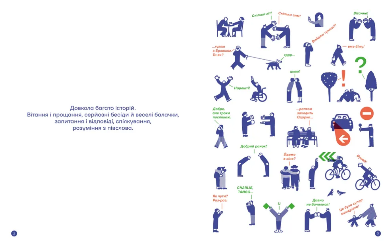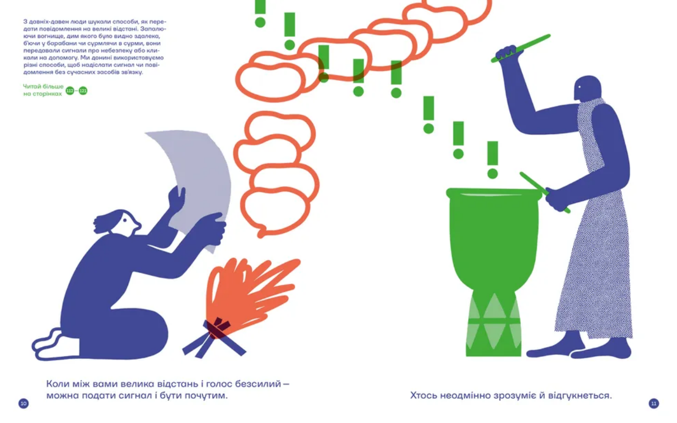 Ділитися думками та почуттями, знаходити спільну мову, розповідати історії й чути їх, розмовляти очі в очі, або на відстані, чи просто проводити час разом — це і є спілкування. Ця книга у незвичний спосіб розповість про різні способи передавання повідомлень, про спілкування не лише людей, а й тварин, комах, рослин. А ще допоможе збагнути зв’язки на клітинному рівні та сигнали з далекого космосу, спілкування через феромони і біолюмінесценцію, через брижі на воді, димові сигнали. Розкаже про історію спілкування колись і нині, про вербальне і невербальне, усне і писемне, живе й електронне, спілкування через дотик і візуальну комунікацію. Про двійковий код, абетки Морзе і Брайля, мову жестів, прапорців та фонетичну абетку. А ще про таємні мови, шифри й коди. Про те, як зрозуміти вашого кота, собаку чи папугу. І навіть про те, як спілкуються томати. Усе це та багато іншого ви зможете прочитати і побачити у цій книзі.