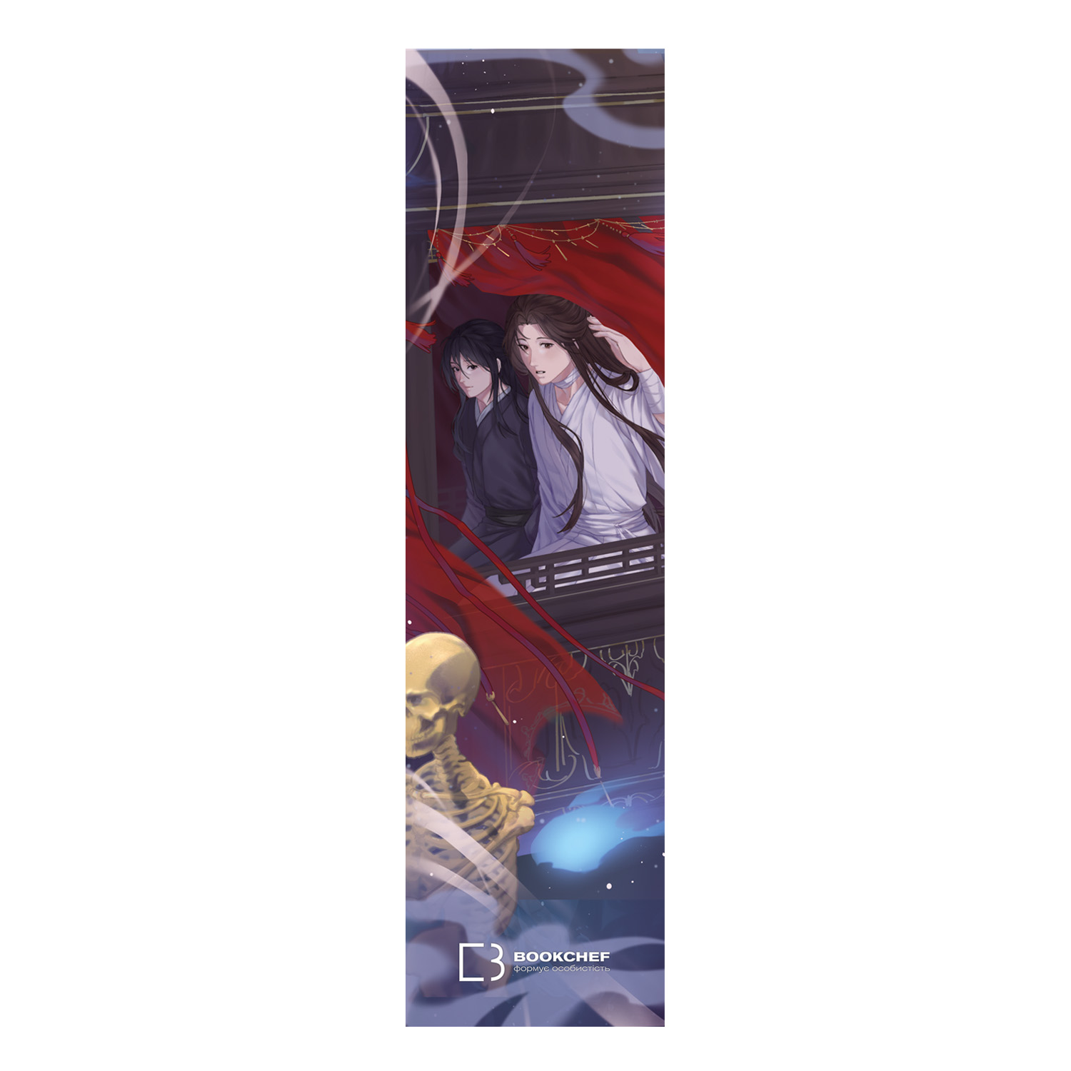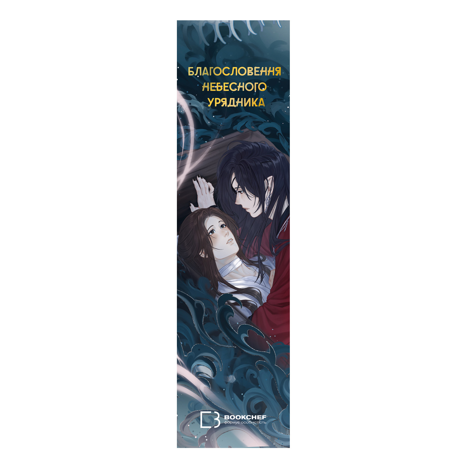 Закладинка soft-touch до книги 4 «Благословення Небесного Урядника» відрізняється вдалими ілюстраціями та якісним виготовленням. На фронтальній стороні зображені Сє Лянь і Хва Чен, коли вони пливуть у труні по Примарному Темноводді. На зворотному боці – головні герої в паланкіні, який несуть золоті скелети. Закладинка сподобається не тільки фанатам серії, а й новим читачам. Ламінування soft-touch робить її оксамитовою на дотик. Вгорі виробу – золоте фольгування. Внизу – логотип BookChef. Розміри закладинки – 20 х 5 см.