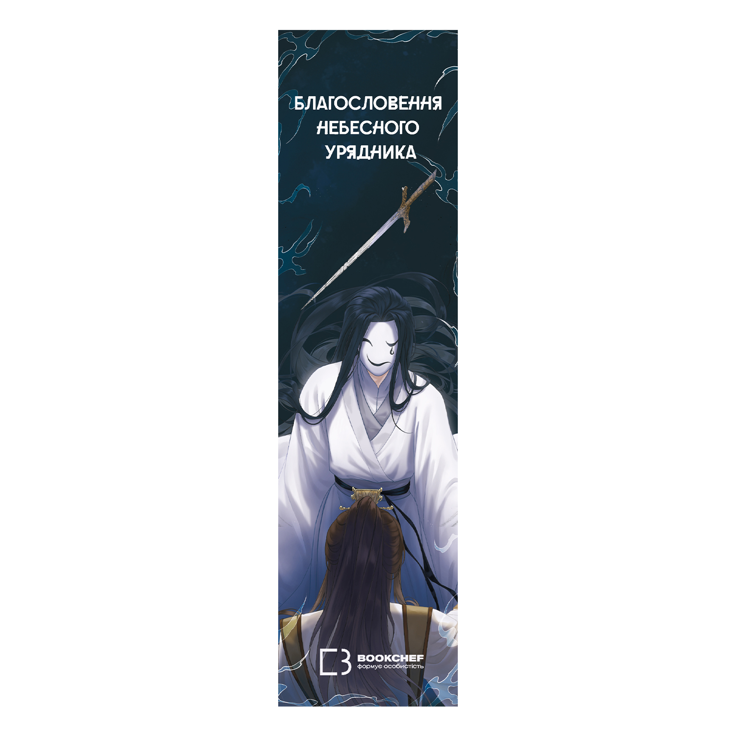 Оригінальна закладинка soft-touch, що має дизайн за третьою книгою М. Тонсьов «Благословення Небесного Урядника», – це маленький артшедевр, на якому зображений один із сюжетних поворотів твору. Закладинка сподобається не тільки фанатам серії, а й новим читачам. Ламінування soft-touch робить її оксамитовою на дотик. На фронтальній стороні – моторошний малюнок зустрічі з Істотою в білому. На тильній – стильний візерунок в темних тонах. Вгорі виробу – срібне фольгування. Виразними срібними буквами написана назва твору. Також є логотип BookChef. Розміри закладинки – 20 х 5,2 см.