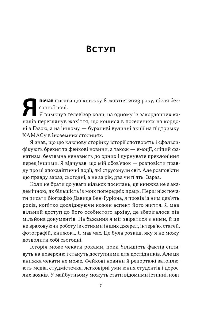 7 жовтня 2023 року стало однією з найтрагічніших дат в історії Ізраїлю. Варварський напад ХАМАСу на прикордонні поселення та мирну рейв-вечірку приніс масові вбивства, руйнування та захоплення заручників. Світ побачив жахливі кадри злочинів терористів і в той самий час — хвилі підтримки ХАМАСу в іноземних столицях. Уже 8 жовтня письменник та історик Міхаель Бар-Зохар почав писати цю книжку, щоб зафіксувати правду, ще не спотворену сліпим фанатизмом і пропагандою.