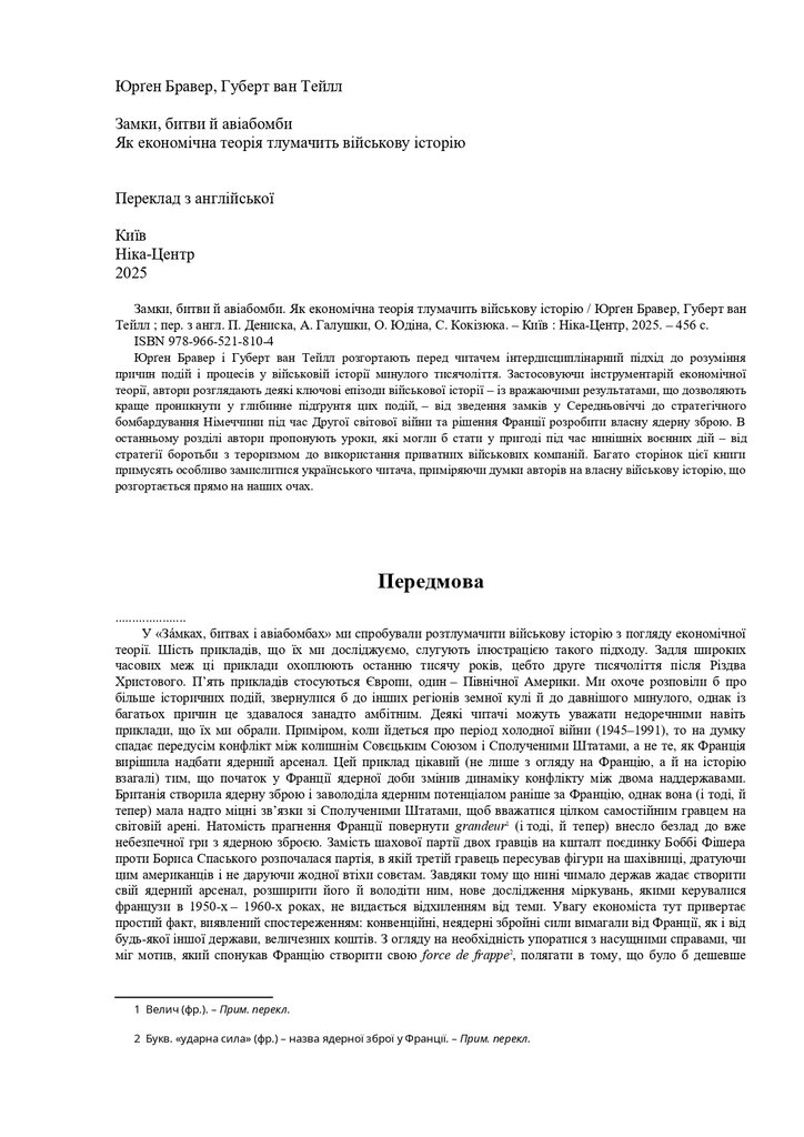 Автори перед читачем інтердисциплінарний підхід до розуміння причин подій і процесів у військовій історії минулого тисячоліття. Застосовуючи інструментарій економічної теорії, автори розглядають деякі ключові епізоди військової історії – із вражаючими результатами, що дозволяють краще проникнути у глибинне підґрунтя цих подій, – від зведення замків у Середньовіччі до стратегічного бомбардування Німеччини під час Другої світової війни та рішення Франції розробити власну ядерну зброю. В останньому розділі автори пропонують уроки, які могли б стати у пригоді під час нинішніх воєнних дій – від стратегії боротьби з тероризмом до використання приватних військових компаній. Багато сторінок цієї книги примусять особливо замислитися українського читача, приміряючи думки авторів на власну військову історію, що розгортається прямо на наших очах.