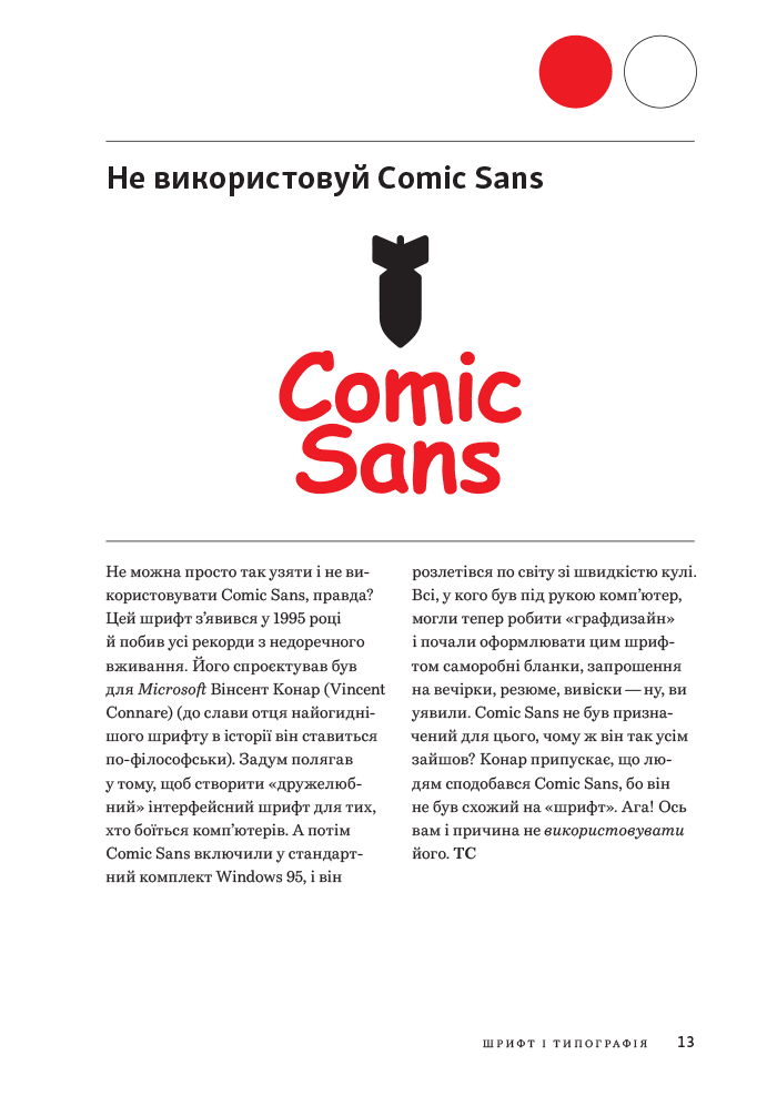 Смисл цієї книжки — допомогти дизайнеру в ремеслі, озброїти його правилами, порадами й методами. Ми поговоримо про типографію, композицію, колір і зображення. Саме ці інгредієнти, якщо їх поєднати сильною, переконливою концепцією, дають у підсумку дизайнерське рішення. Якби я був шеф-кухарем, то хотів би готувати з найкращих інгредієнтів: найкращий рецепт плюс найкращі продукти й приправи. Навряд чи можна розраховувати на шедевр, якщо замість свіжого тунця мусиш вдовольнятися консервованим, а замість стиглих помідорів — томатним соусом із пакетика. Те саме стосується дизайну. Продуманий шрифт на рівні з Гарамоном, індивідуально підібрана палітра і вдала фотографія дадуть більше, ніж безкоштовна гарнітура з інтернету, кольори, що їх на автоматі пропонує софт, і перше-ліпше фото зі стоку.Коли опанував «правильний» спосіб дизайнувати й переконався, що кожне тире на своєму місці, можна підключатися до іншого полюсу дизайнерської особистості. Тоді й можна буде знаходити несподівані, провокативні ходи, кидати виклик усталеному порядку речей, пробувати альтернативні процеси виробництва. Однак навіть у цьому випадку та іпостась дизайнера, що ревно стежить за дотриманням правил і шукає досконалості, повинна час від часу втручатися й перевіряти, чи знайдене рішення ясне й чи спроможне полонити глядача.