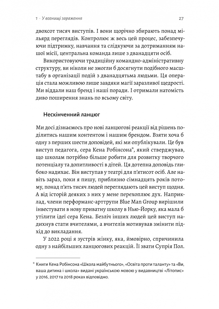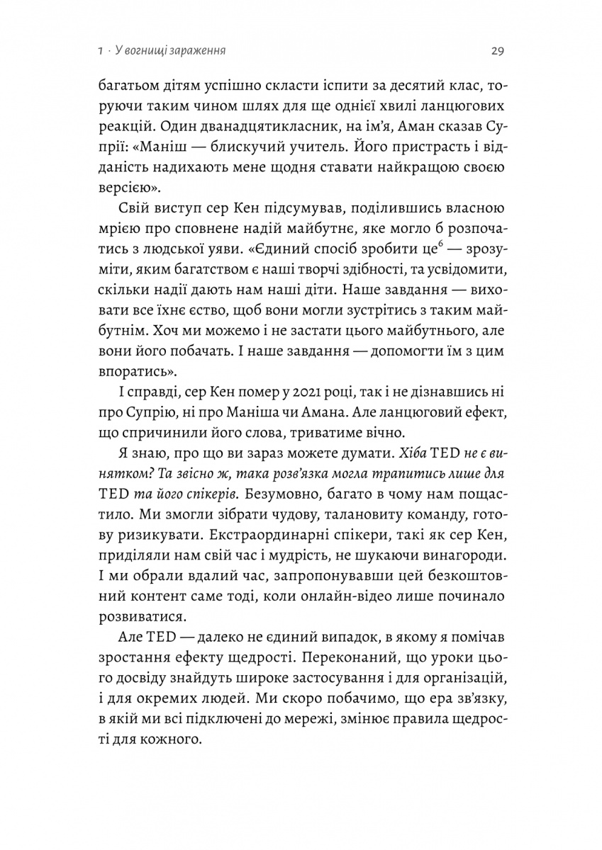 Кріс Андерсон розповідає історії, що надихають, і пропонує інструкцію того, як почати робити щедрі вчинки: дарувати гроші, час, талант, зв'язки чи доброту — і завдяки інтернету надавати їм здатність до самовідтворення, що змінює світ.