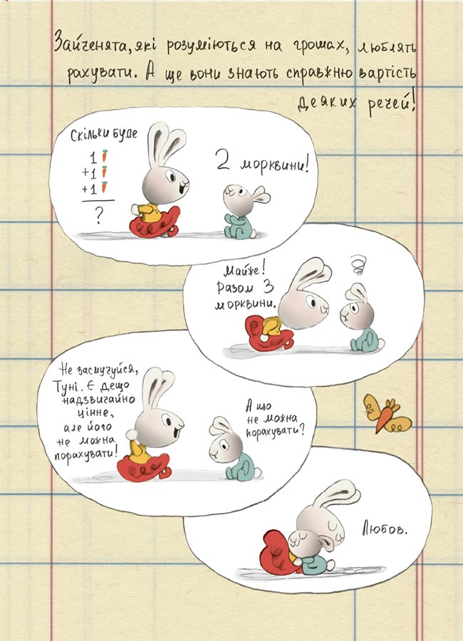 Як пояснити малюкові, звідки гроші? Книжка про зайчуню Банні розповість дитині просту концепцію — щоб досягти бажаного, треба працювати. Банні хоче бути заможною й знаменитою. Матуся пояснює, що гроші треба заробляти, слави набувати, і дає гарну пораду доньці. Що більше Банні обчислювала та мріяла про майбутню кар’єру, то більше їй подобалася ідея заробити собі на навчання і втілити мрію — бути зіркою!