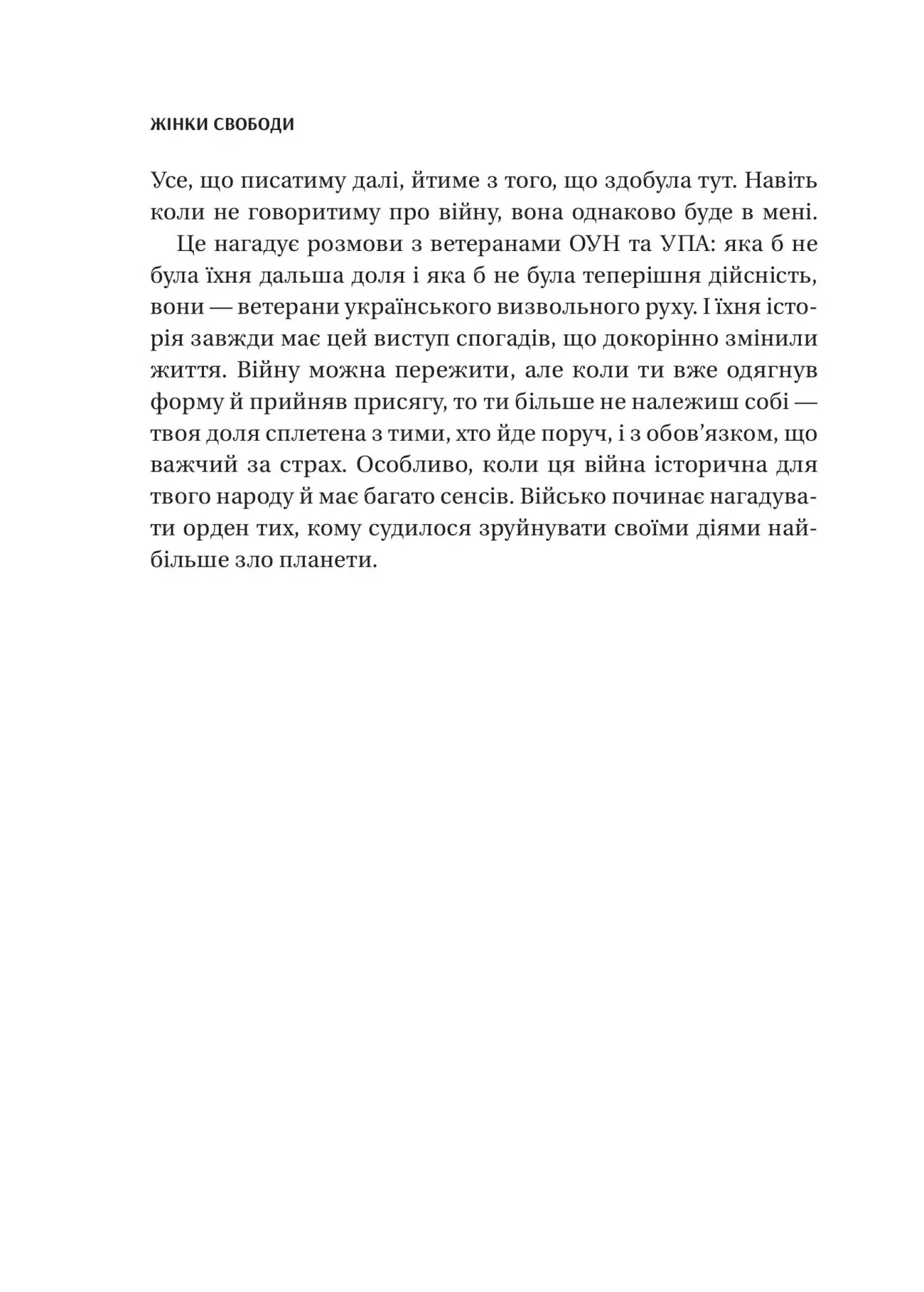«Жінки Свободи» — це розповіді про жінок у лавах ОУН та УПА. Жінок, які усвідомлено обрали боротьбу та підпілля. Юні, сповнені жаги життя, мрій і запалу. Люди, які творили історію. Які доводили до сказу окупантів і платили надвисоку ціну. Імена, про які ми знаємо дуже мало або не знаємо нічого. Або ж знаємо лиш те, що нав’язала радянська влада.