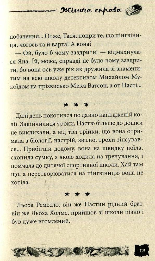 Звісно, що, дізнавшись про напади на подруг, Льоха Холмс і Миха Ватсон беруться шукати загадкового й підступного Пінгвіна. Тобто розплутувати так звану "жіночу" справу. Але на те вона й жіноча, щоб усе було не так просто, як видається на перший погляд.