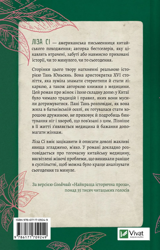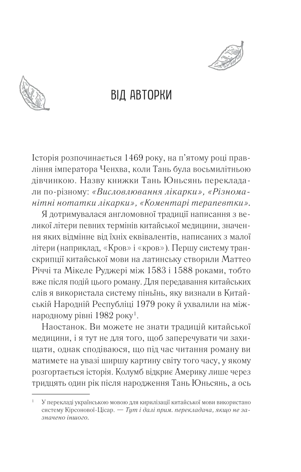 Сторінки цього твору натхненні реальною історією Тань Юньсянь. Вона аристократка XVI століття, яка зуміла зламати стереотипи й стати лікаркою, а також авторкою книжки з медицини. Цей роман про жінок і їхню складну долю: у Китаї було чимало традицій і правил, яких вони мусили дотримуватися. Пані Тань розповідає, як вона жила в батьківській оселі, як готувалася стати хорошою дружиною, не приховує й подробиць бинтування ніг і хвороб, що пов'язані з цим. Пізніше в її житті з'являється медицина й бажання допомагати жінкам.