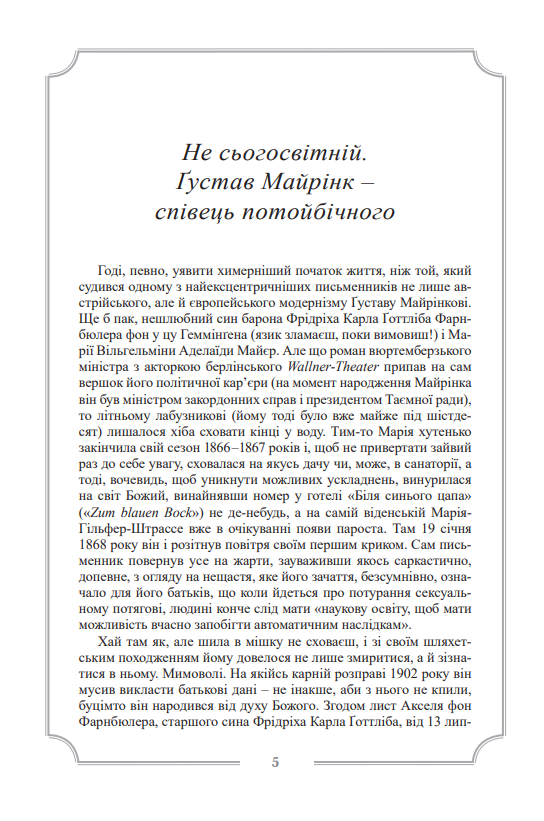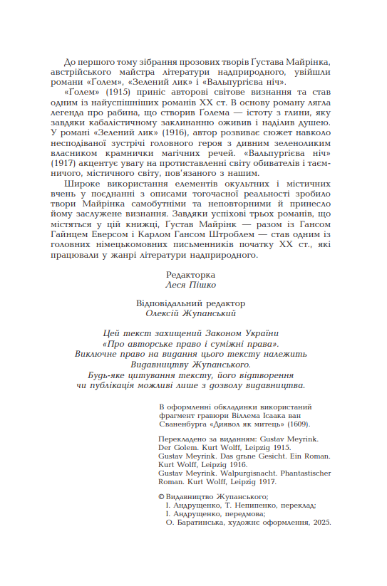 Широке використання елементів окультних і містичних вчень у поєднанні з описами тогочасної реальності зробило твори Майрінка самобутніми та неповторними й принесло йому заслужене визнання. Завдяки успіхові трьох романів, що містяться у цій книжці, Ґустав Майрінк — разом із Гансом Гайнцем Еверсом і Карлом Гансом Штроблем — став одним із головних німецькомовних письменників початку XX cт., які працювали у жанрі літератури надприродного.
