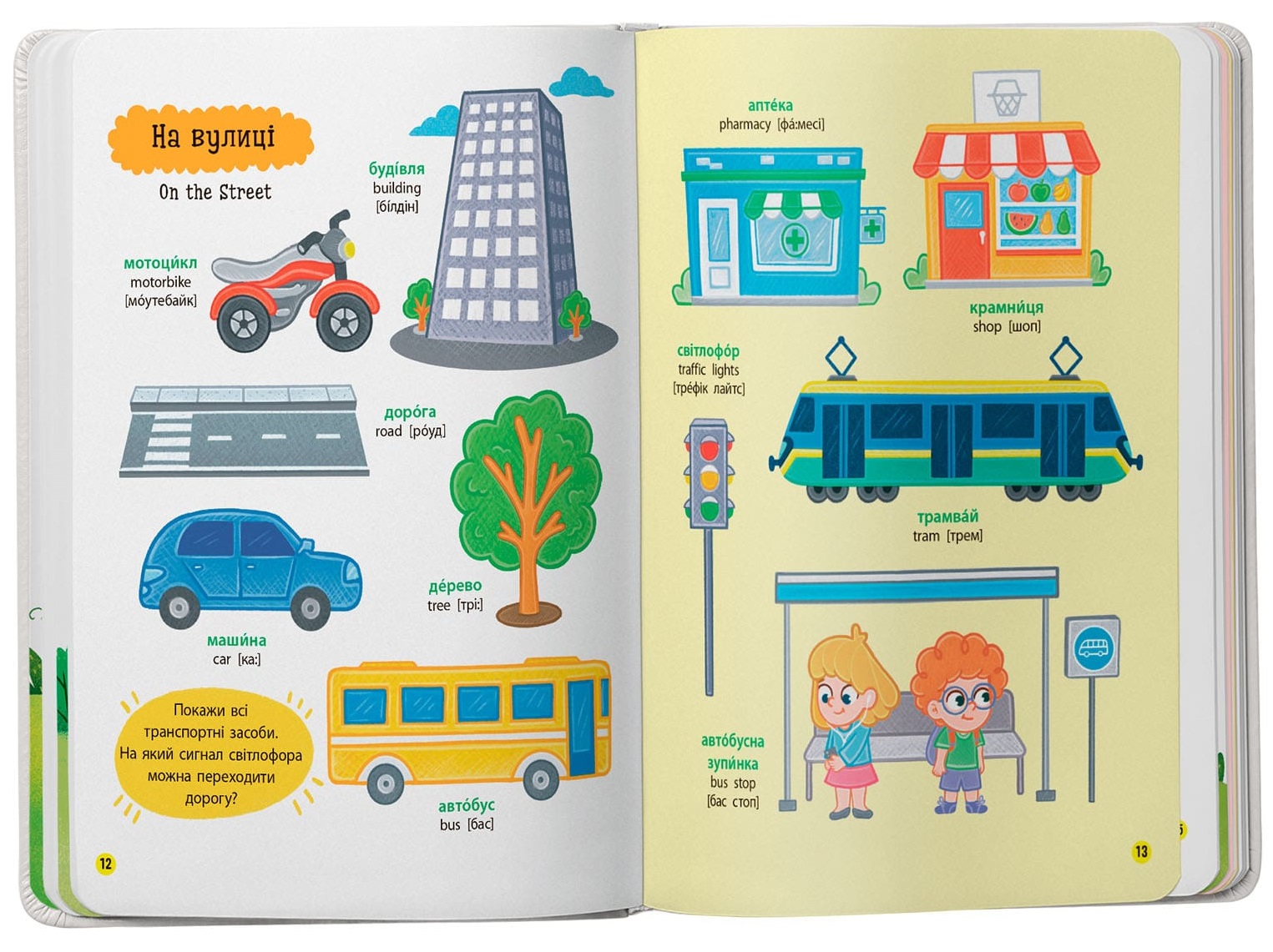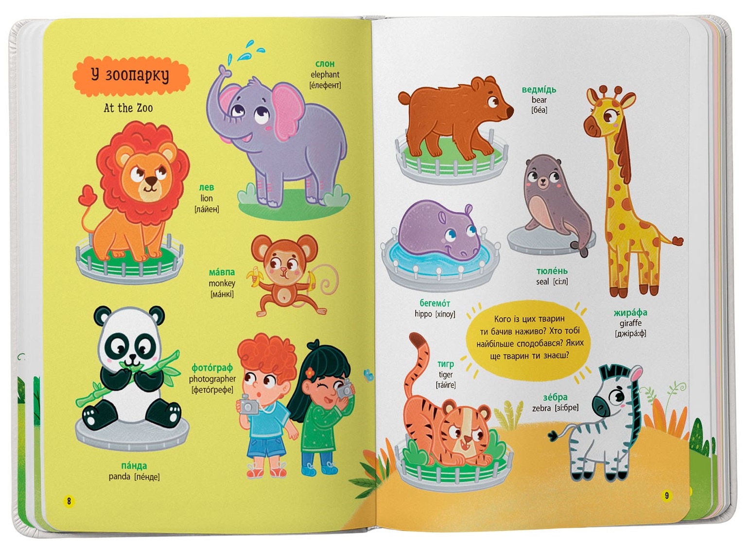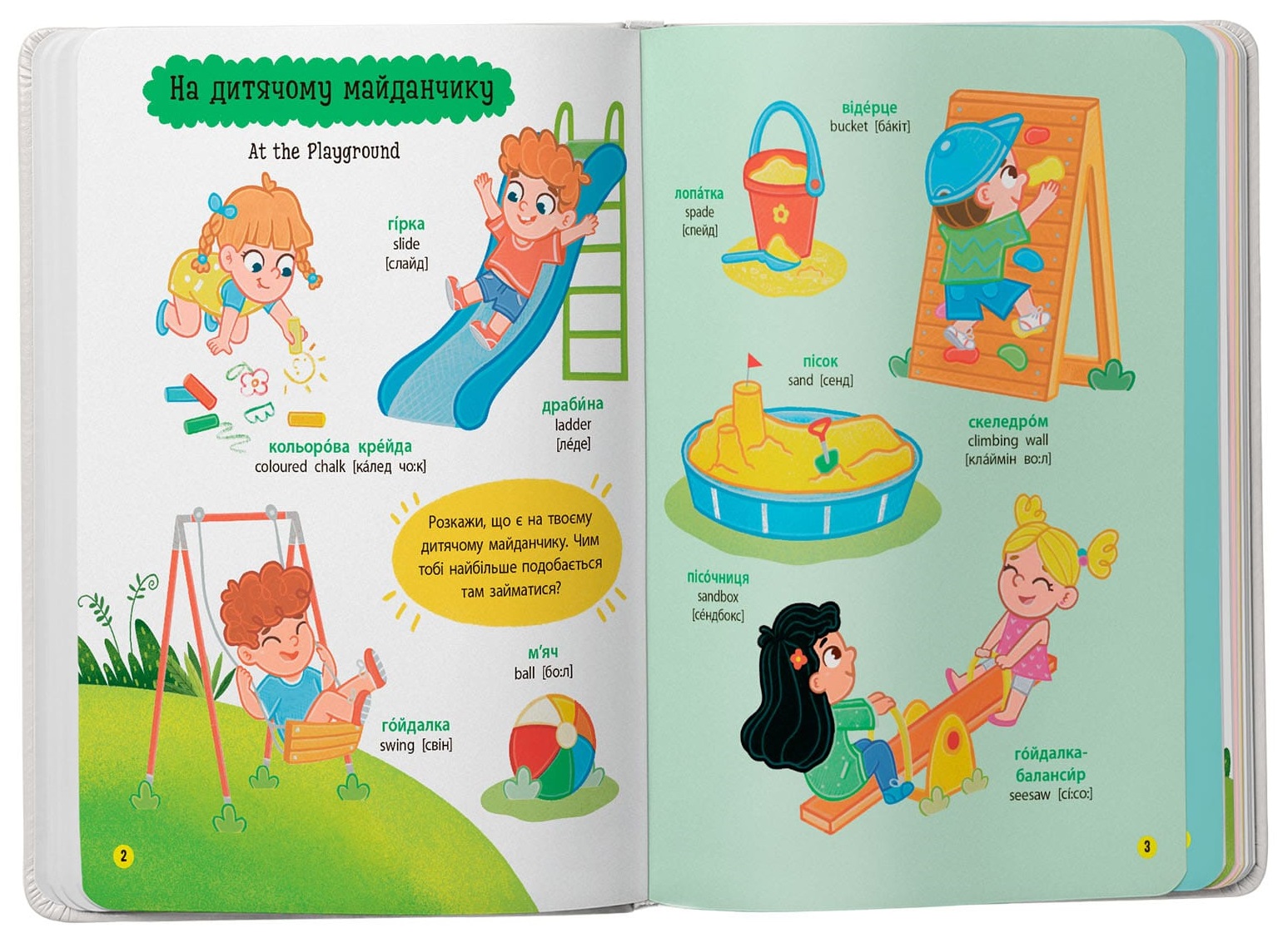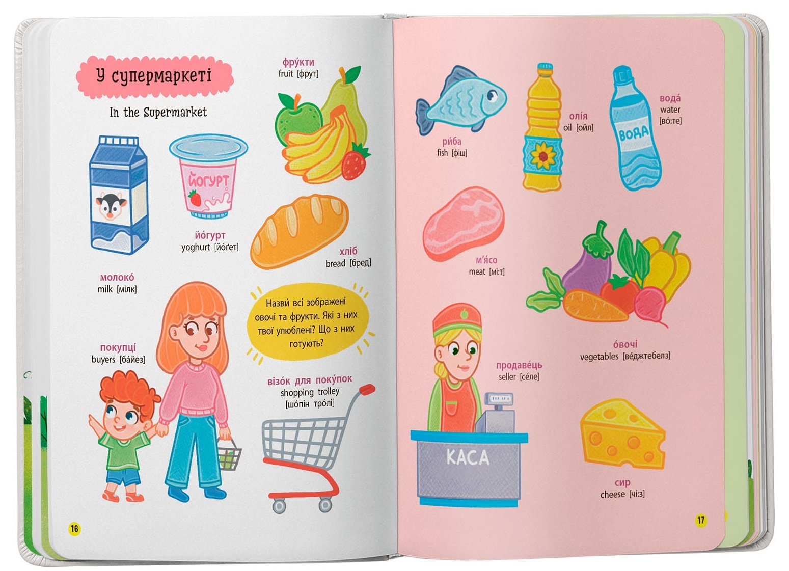 Ця книжка допоможе дитині в ігровій формі засвоїти нові слова, навчитися чітко та правильно їх вимовляти, а також сприятиме розвитку логічного мислення та вивченню навколишнього світу. На кожному розвороті малюк бачитиме великі кольорові малюнки, запам’ятовуватиме нові слова, відшукуватиме задані предмети, відповідатиме на запитання. Підписи в книжці подано двома мовами, що зробить вивчення англійської легким і веселим навіть для найменших.