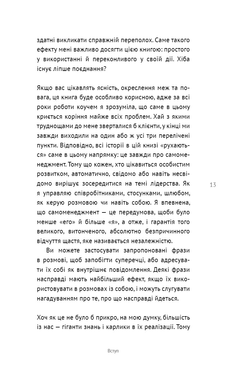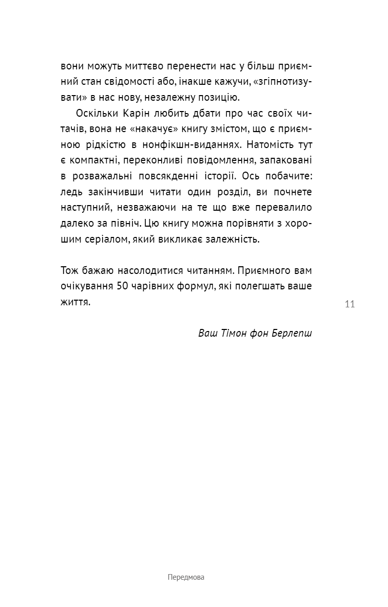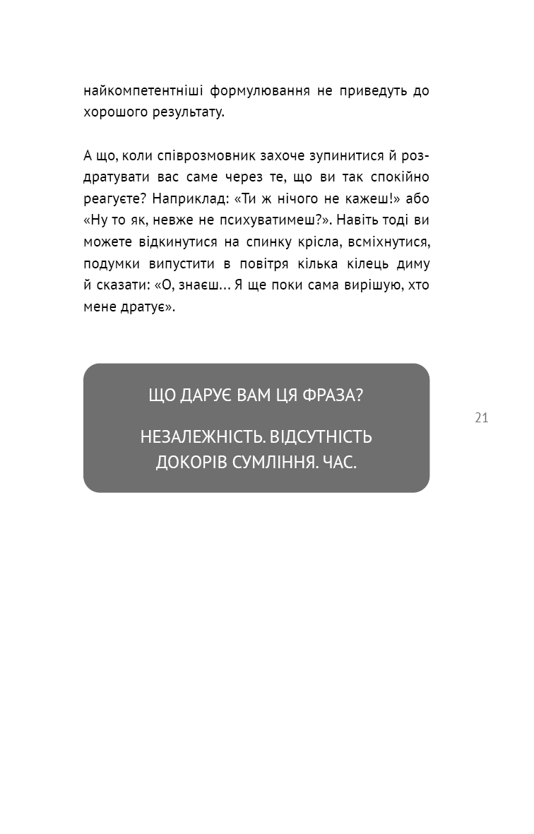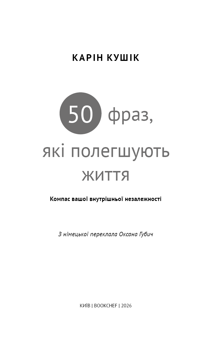 Часто лише одна влучна фраза, сказана вчасно, здатна змінити наше сприйняття ситуації, людини чи й себе самого. Саме за ці влучність, точність, чесність і відвертість Карін Кушік вдячні тисячі її клієнтів і читачів, яким вона допомогла зрозуміти найважливіші в їхньому житті речі. Понад 20-річний досвід роботи із представниками топ-менеджменту великих компаній, акторами, бізнесменами дав їй можливість збагнути, що саме потрібно для досягнення успіху, добробуту, достатку, а головне — внутрішньої рівноваги. Ці знання вона сформулювала в 50 фразах, які можуть полегшити ваше життя.