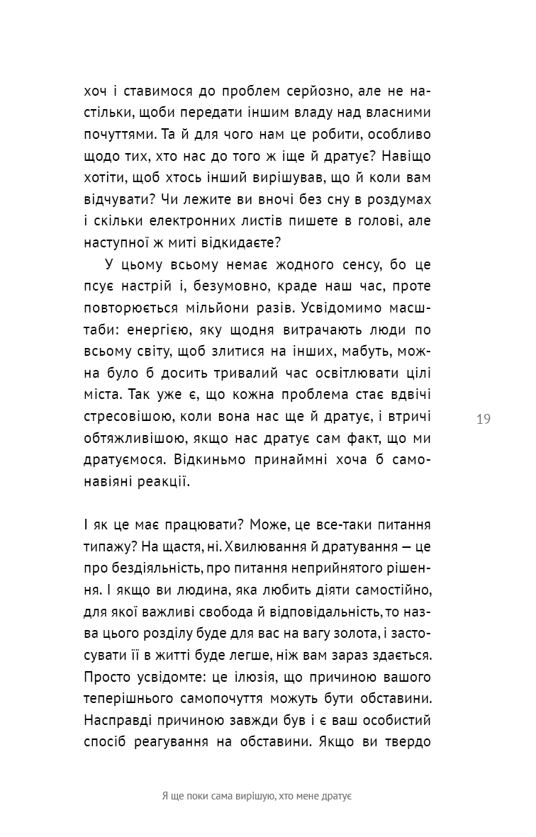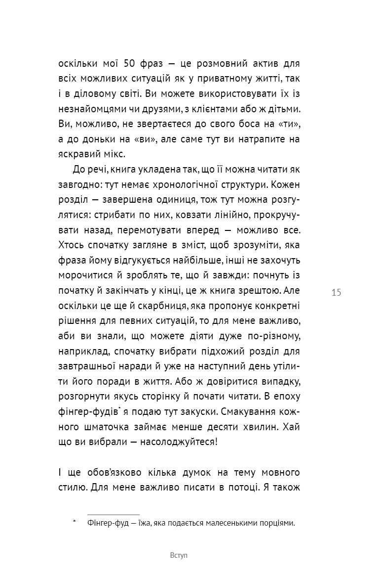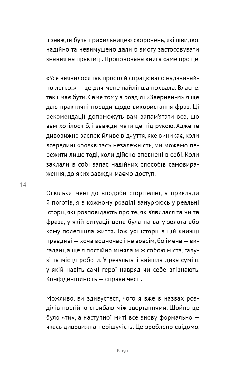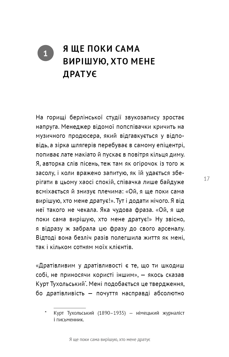 Часто лише одна влучна фраза, сказана вчасно, здатна змінити наше сприйняття ситуації, людини чи й себе самого. Саме за ці влучність, точність, чесність і відвертість Карін Кушік вдячні тисячі її клієнтів і читачів, яким вона допомогла зрозуміти найважливіші в їхньому житті речі. Понад 20-річний досвід роботи із представниками топ-менеджменту великих компаній, акторами, бізнесменами дав їй можливість збагнути, що саме потрібно для досягнення успіху, добробуту, достатку, а головне — внутрішньої рівноваги. Ці знання вона сформулювала в 50 фразах, які можуть полегшити ваше життя.