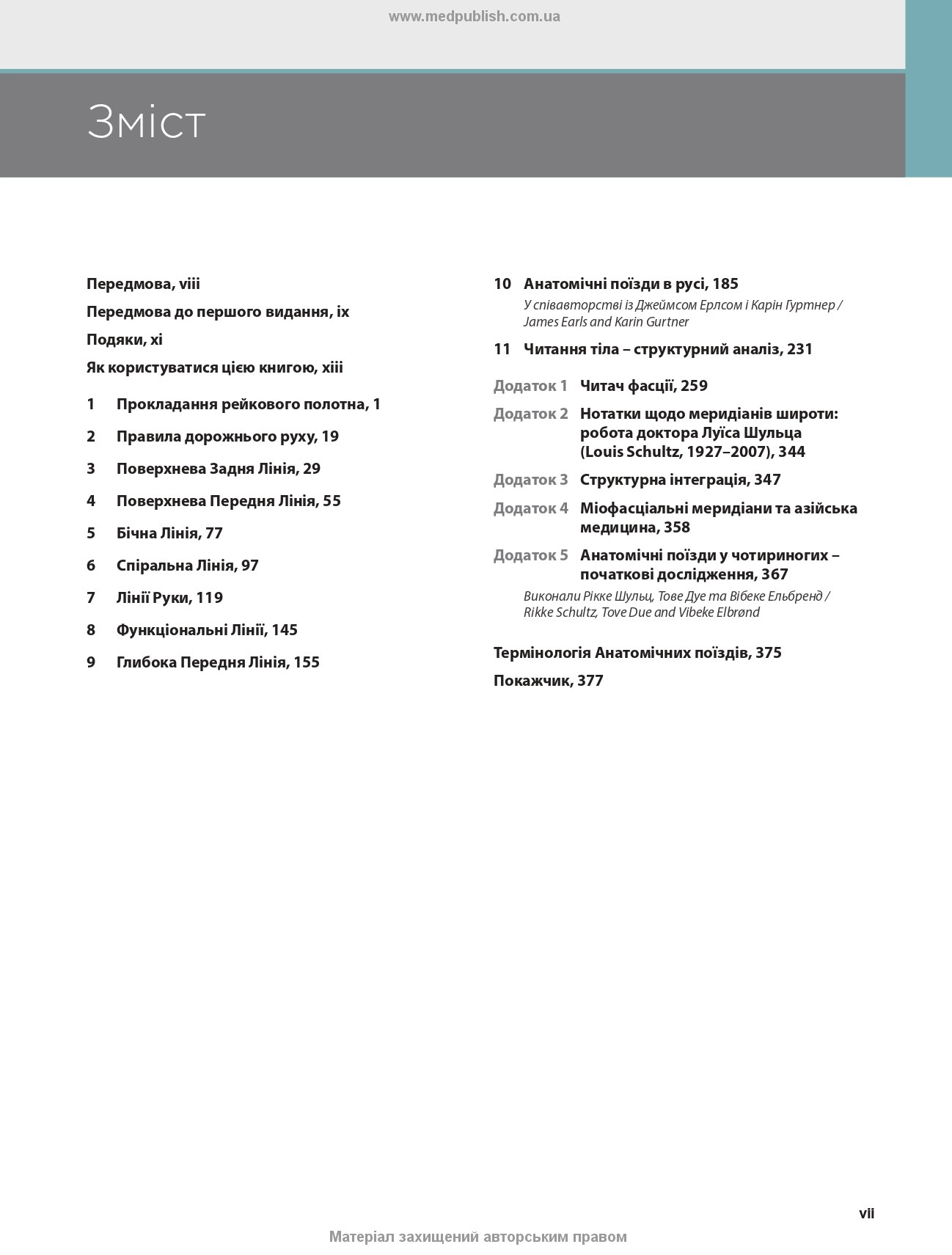 Традиційний підхід до анатомії передбачає вивчення кожного м’яза окремо: від одного кінця до іншого, від кістки до кістки. Цей посібник натомість розширює розуміння про міофасціальне передавання зусиль та можливі наслідки порушення розподілу напруження на певній віддалі від місця травми або болю.
