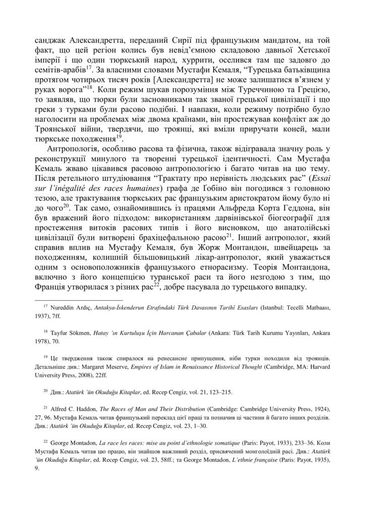 Значну увагу автор приділяє книжкам та журналам, європейським і турецьким, з яких Мустафа Кемаль засвоїв популярні на Заході, хоч і вельми сумнівні та утопічні теорії кінця ХІХ – початку ХХ ст., зокрема, вульгарний матеріалізм, моральний дарвінізм, позитивізм, націоналізм, расову антропологію, авторитаризм. У дослідженні також наведено галерею осіб, з якими Ататюрк ділився задумами або, навпаки, сперечався, від яких навчався, кого використовував. У підсумку Ататюрк постає не творцем оригінальних ідей, а політиком, який спромігся втілити утопічні проекти маргінальних західноєвропейських інтелектуалів свого часу.