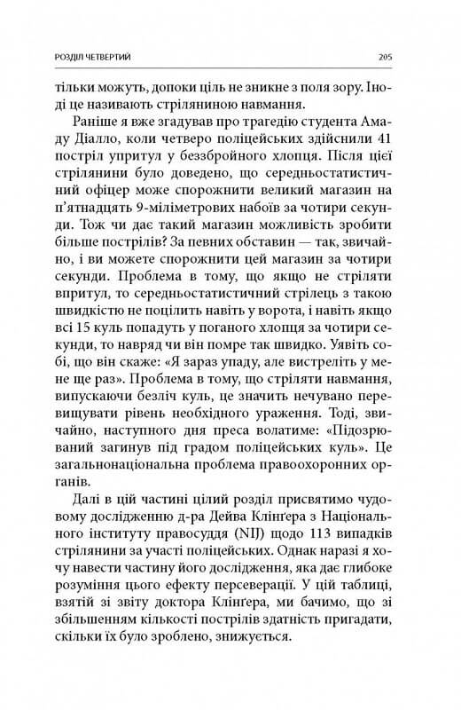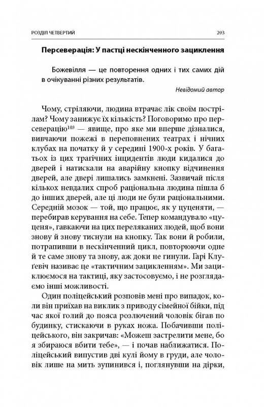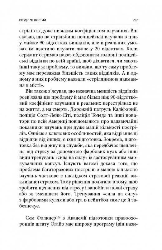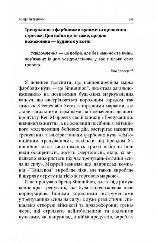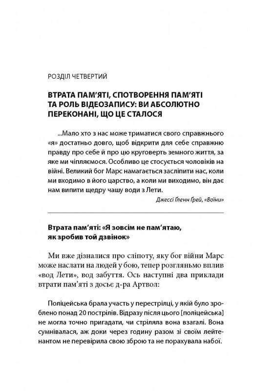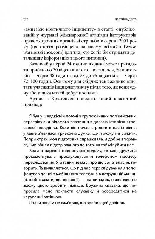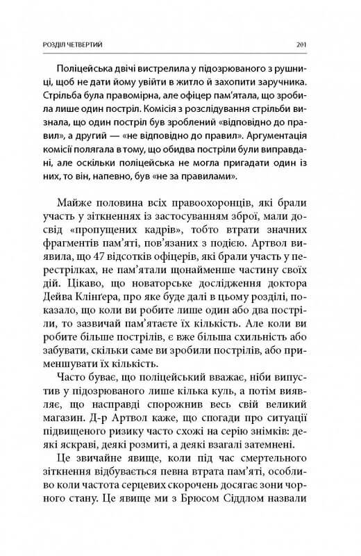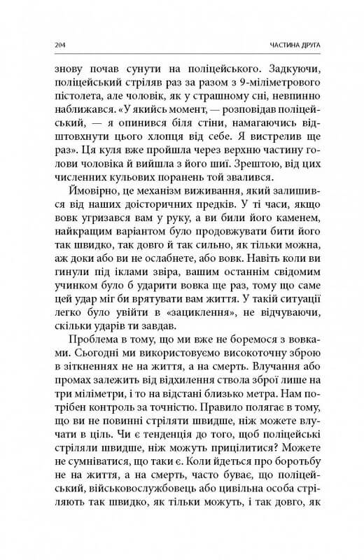 На ці та інші запитання, що постають перед учасниками бойових дій та правоохоронцями, дають відповідь автори цієї книги: підполковник Дейв Ґроссман — колишній рейнджер Армії США, викладач психології Вест-Пойнту, та Лорен Крістенсен — досвідчений поліцейський, ветеран війни у В’єтнамі.
