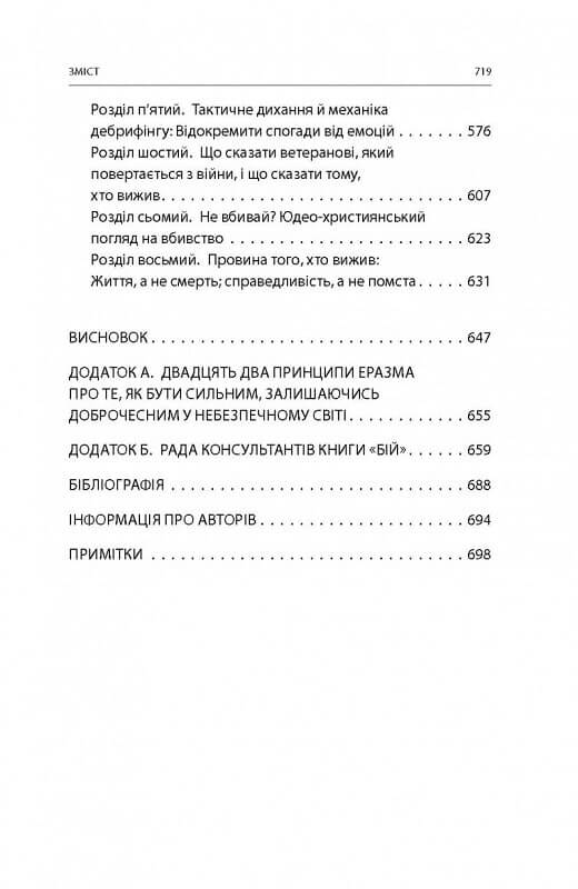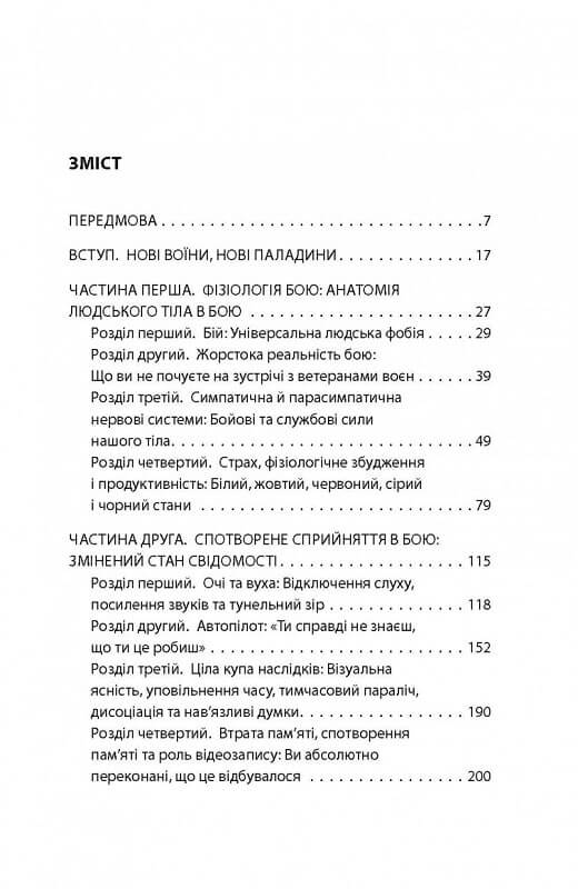 Читач дізнається про психологічну еволюцію бойових дій; про розвиток технік, які сприяють ефективності військовослужбовців та їхній психологічній витривалості й допомагають вийти з токсичного середовища смертоносних боїв зміцнілими тілом та духом.