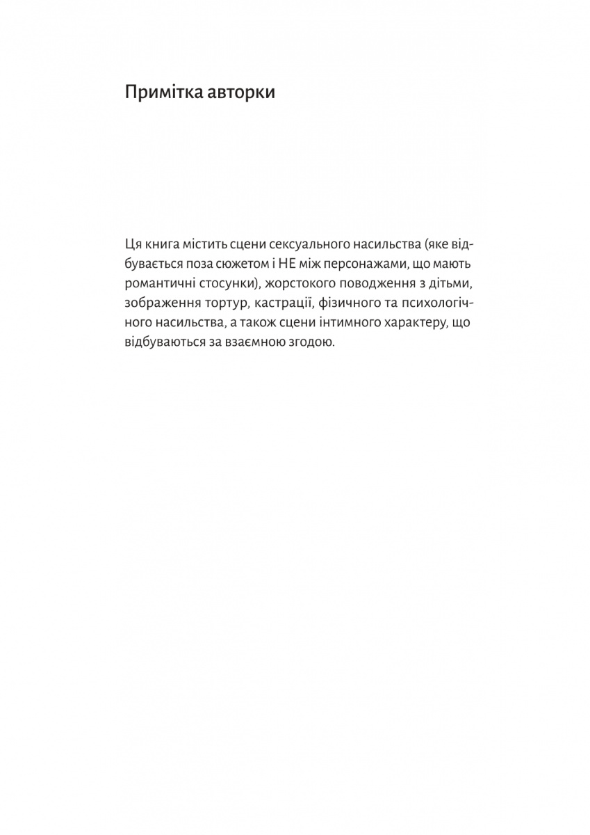 До уваги: твір містить сцени жорстокості, фізичного, сексуального й психологічного насилля, а також відверті інтимні сцени, що можуть завдати дискомфорту чутливим читачам.