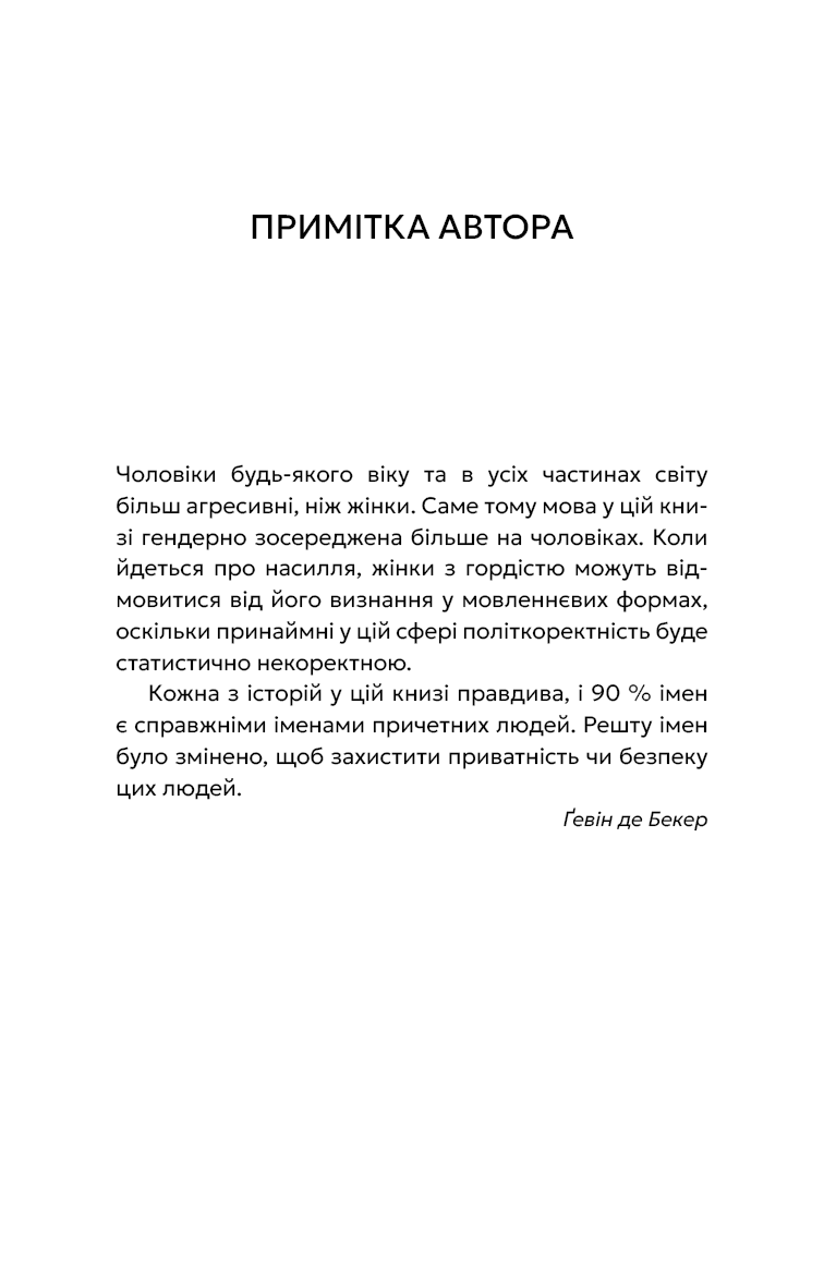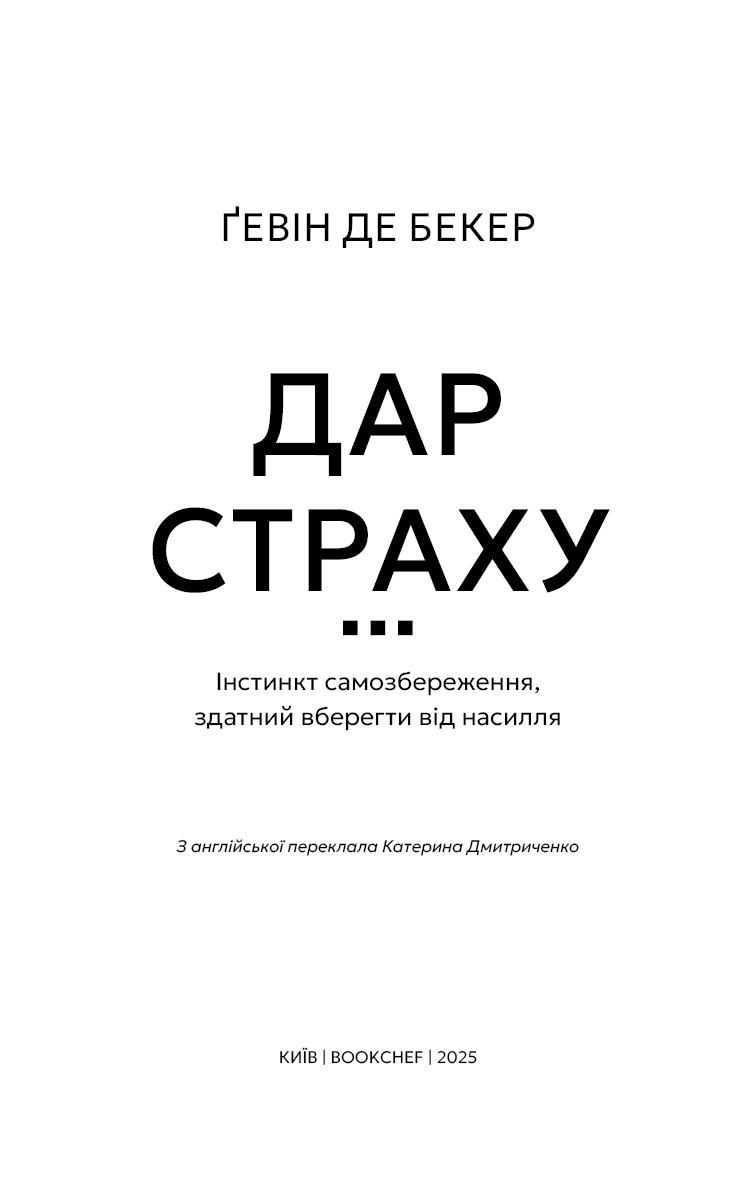 Виживання тварин і наших предків — мавп ґрунтувалося не на аналізі й обмірковуванні можливих загроз, а на інтуїтивному зчитуванні геть незначних для розуму сигналів і миттєвій інстинктивній реакції. З розвитком мозку, раціонального мислення, аналітичних здібностей і технологій людина поступово втрачала здатність чути свою інтуїцію й діяти так, як підказують досвід поколінь і тваринна реакція. У книзі «Дар страху» автор пропонує повернутися до інстинктів, покликаних уберегти наше життя, й спирається на свою багаторічну роботу охоронця, а згодом — власника фірми, що займається охороною особливо важливих осіб: політиків, бізнесменів, видатних людей. Найголовніший ключ до самозахисту — довіряти власній інтуїції. Книга «Дар страху» розповідає, як цьому навчитися.