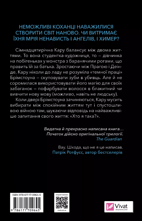 Сімнадцятирічна Кару балансує між двома життями. То вона студентка-художниця, то — дівчинка на побігеньках у монстра з баранячими рогами, що править їй за батька. Зростаючи між Прагою і Деінде, Кару ніколи до ладу не розуміла «темної праці» Брімстоуна — скуповувати зуби в убивць. Але й не не соромилася використовувати його магію для своїх забаганок — пофарбувати волосся в блакитний чи вивчити нову мову (можливо, навіть не людську).