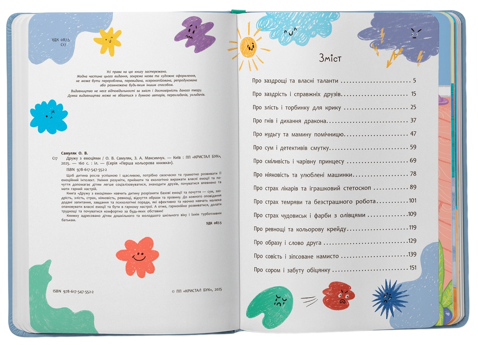 Книга «Дружу з емоціями» навчити дитину розрізняти базові емоції та почуття — сум, заздрість, злість, страх, ніяковість, ревнощі, відчуття образи та провину. До кожного оповідання додані запитання, завдання та психологічні поради, які ефективно та наочно навчати малюка опановувати власні емоції та бути в гарному настрої. А отже, гармонійно розвиватися, долати труднощі та відчуватися комфортно за будь-яких обставин!