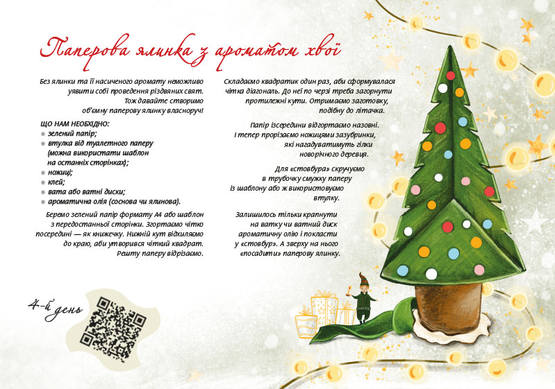 Зимові свята пов’язані у нас із цілим списком запахів: свіжих мандаринів, ароматних чаїв, запашних приправ, солодкого шоколаду, морозного повітря, пахучої хвої, духовитої випічки та іншими. Саме ця ідея і лежить в основі нашого календаря, в якому діти зможуть творити та цікаво проводити свій час, виконуючи духмяні завдання.
