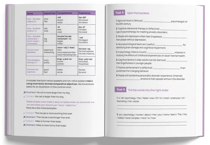 «English for Psychologists» — воркбук для вивчення англійської мови для тих, хто вже працює чи навчається у сфері психології та хоче покращити свою професійну англійську. Також робочий зошит підійде і тим, хто цікавиться цією темою або просто хочеш краще зрозуміти особливості ментального здоров'я.